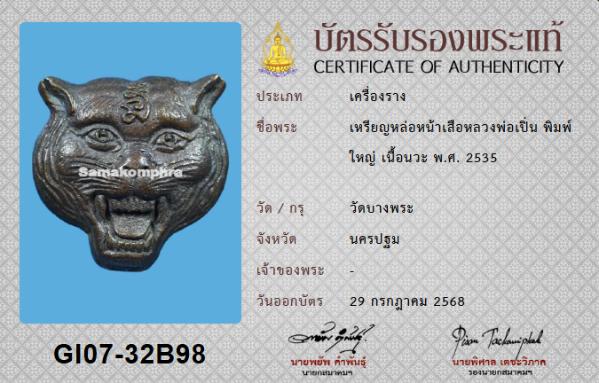 佛曆: 2535年 由龍婆笨大師親自開光加持
