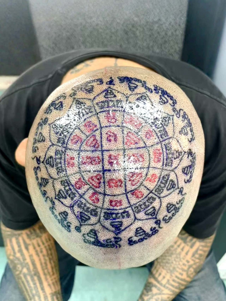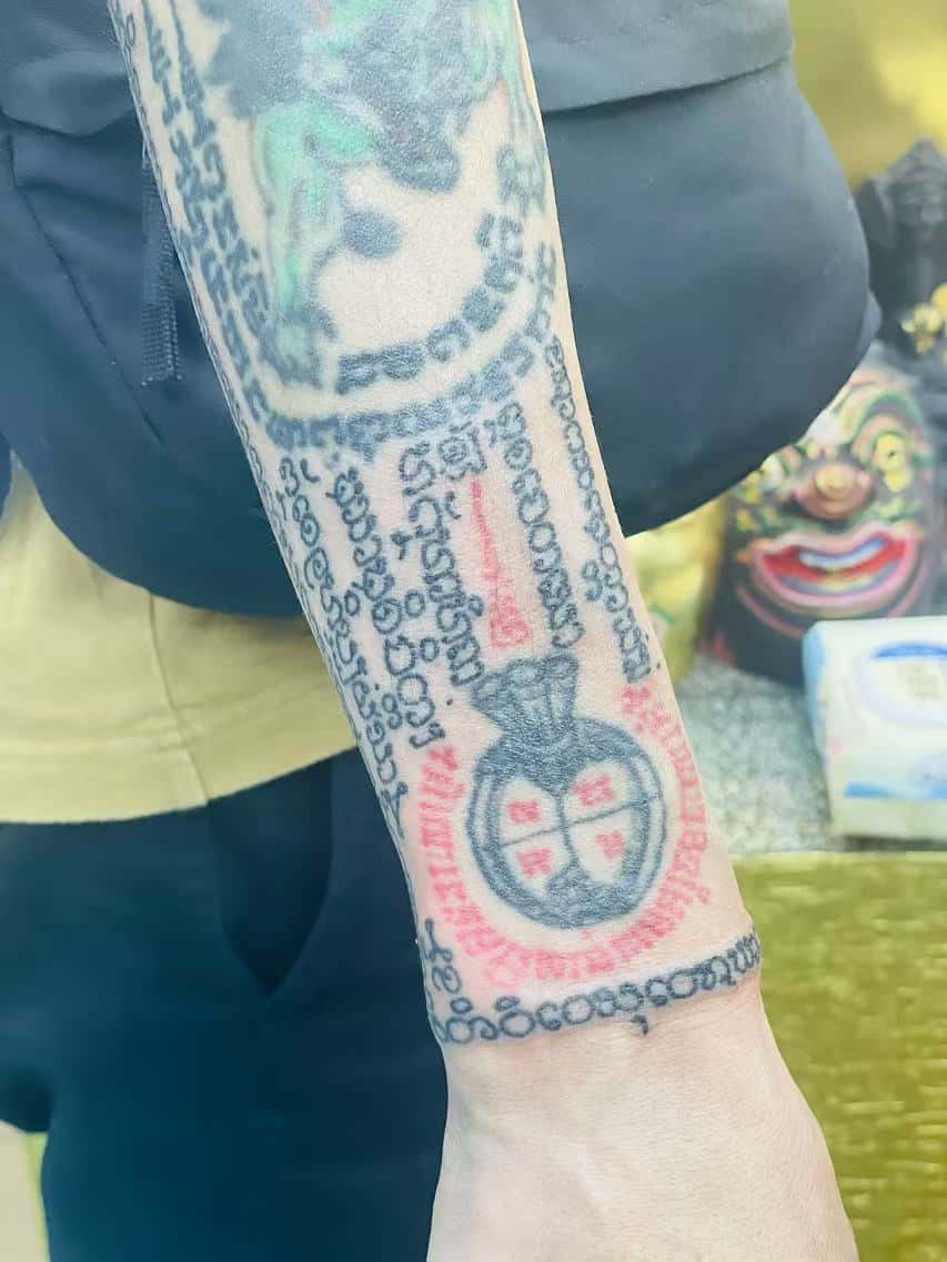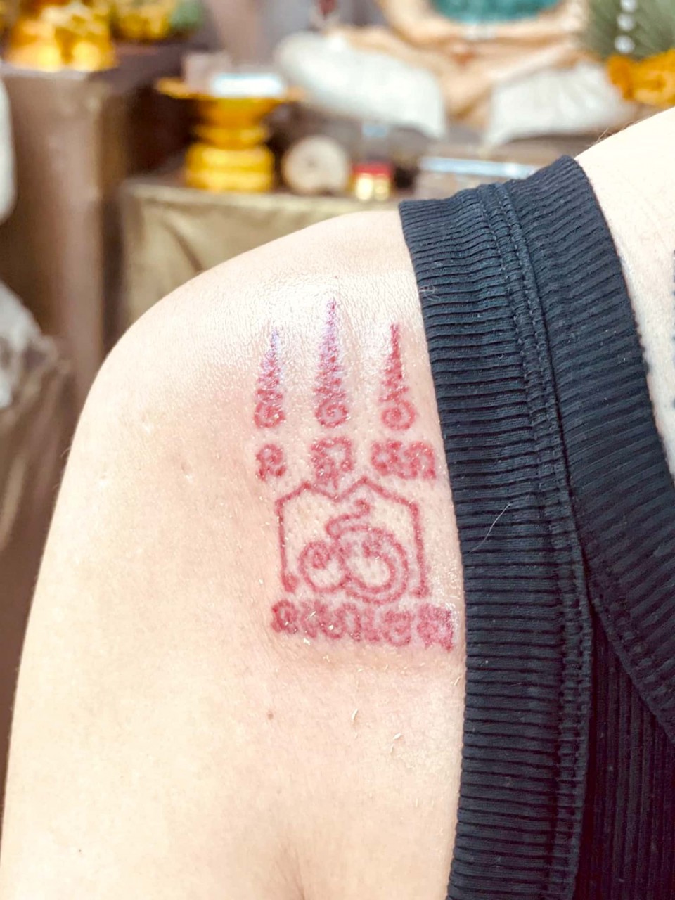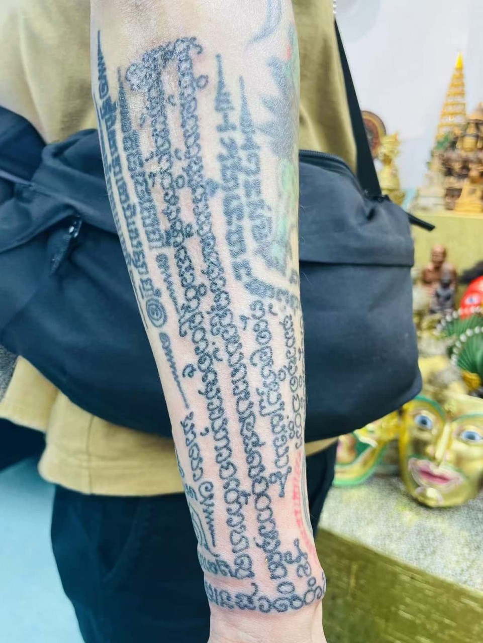 善信可以選擇油刺(透明無色)或 有色刺符,油刺(透明無色)是用古法金針在身上刺上符印,只是金針上不沾墨水,是使用法油刺上,所以刺出來圖印和符印都是沒有顏色的 ,所有刺符無論有色或油刺(透明無色),整個過程和功效都是完全一樣的,刺符不論是有色或無色都是永久有效
