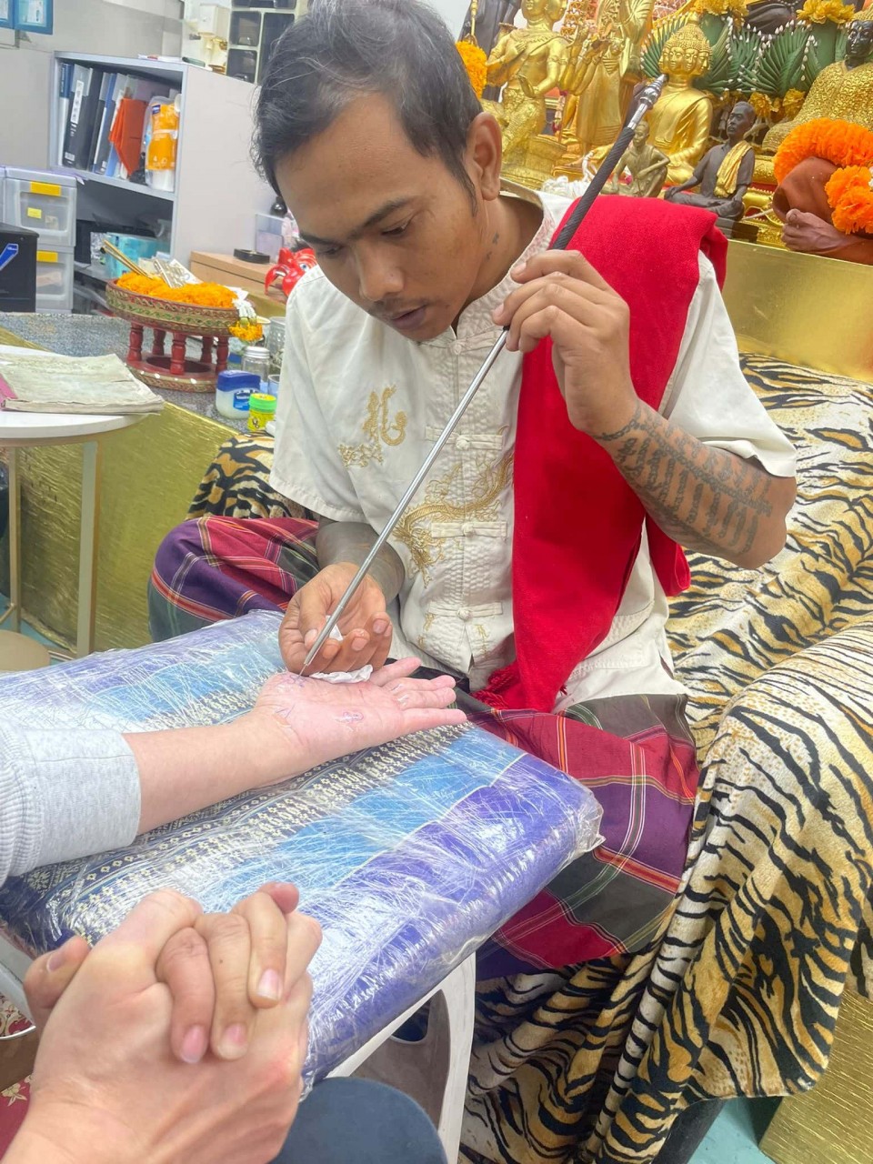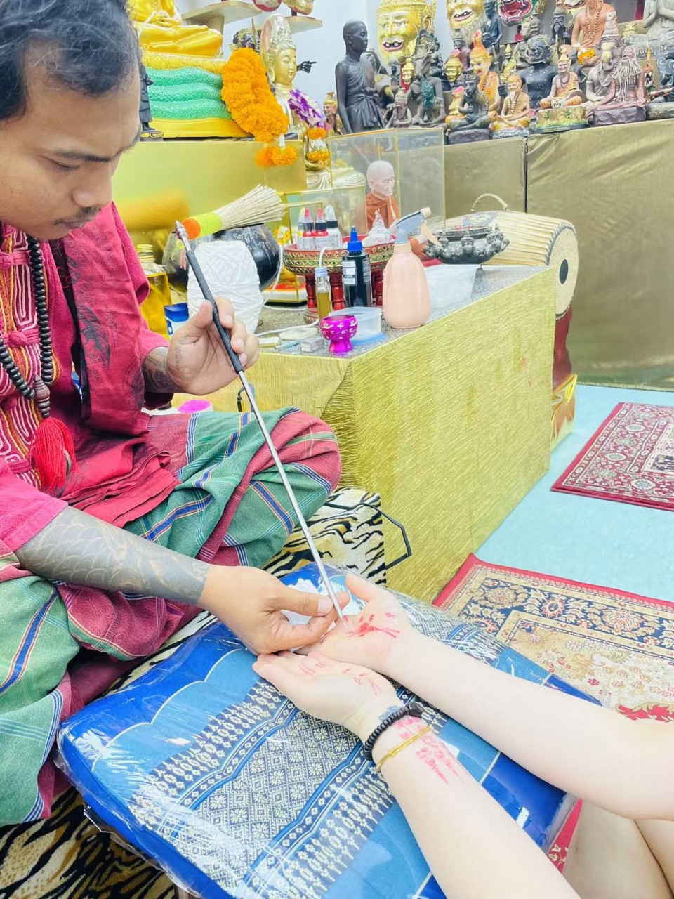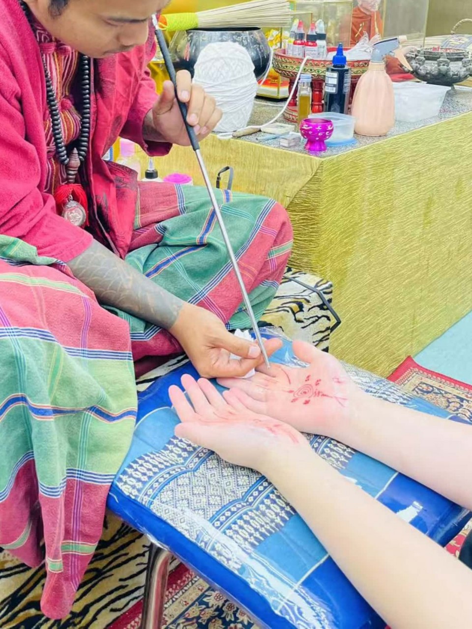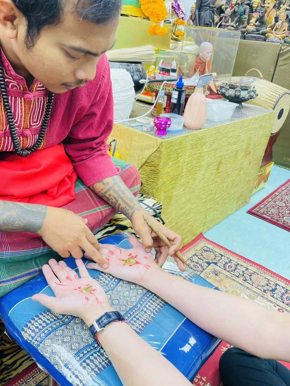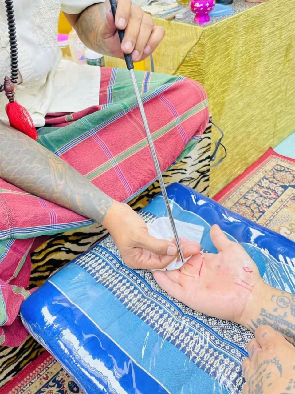 阿贊堆師傅既改命格法事,係善信既雙手刺上掌紋,用泰國古法金針刺上,並且係無色(油刺是沒有顏色的,刺上時所使用的是師傅獨有既法油),因為好多人既掌紋先天不足,阿贊堆師傅就幫善信作後天改命,無論係事業、財富線,感情線,生命線都有辦法去加強加深(當然要由師傅好去決定啦),雖然用古法金針刺上手掌時係有少少痛,但真係可以改善善信既基本命格,刺上之後會做開光儀式並且貼上金箔,依個改命格法事,係永久及永遠有功效既,阿贊堆師傅依個法事可以反覆咁做,做得越多次係越好