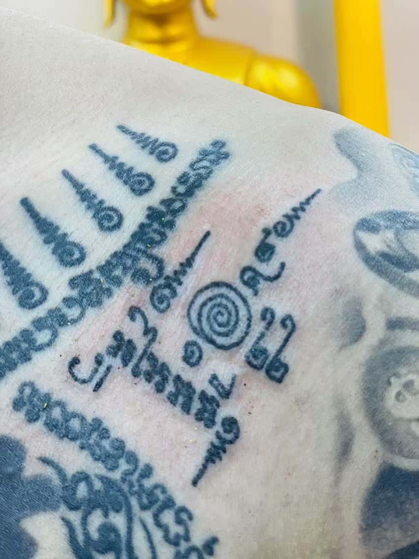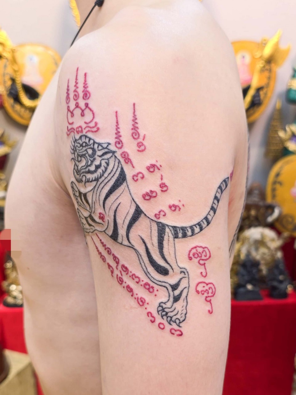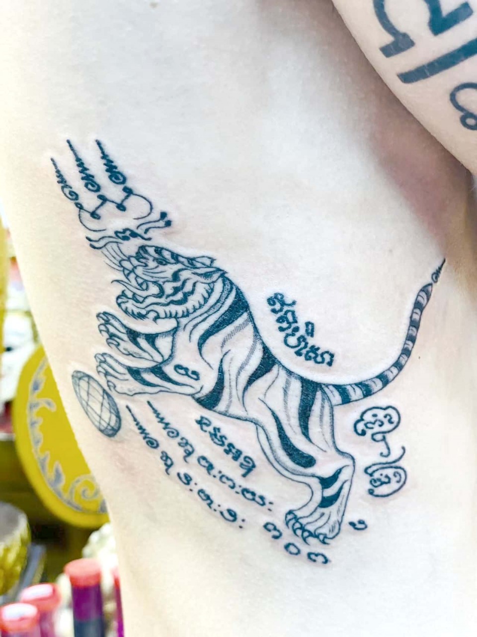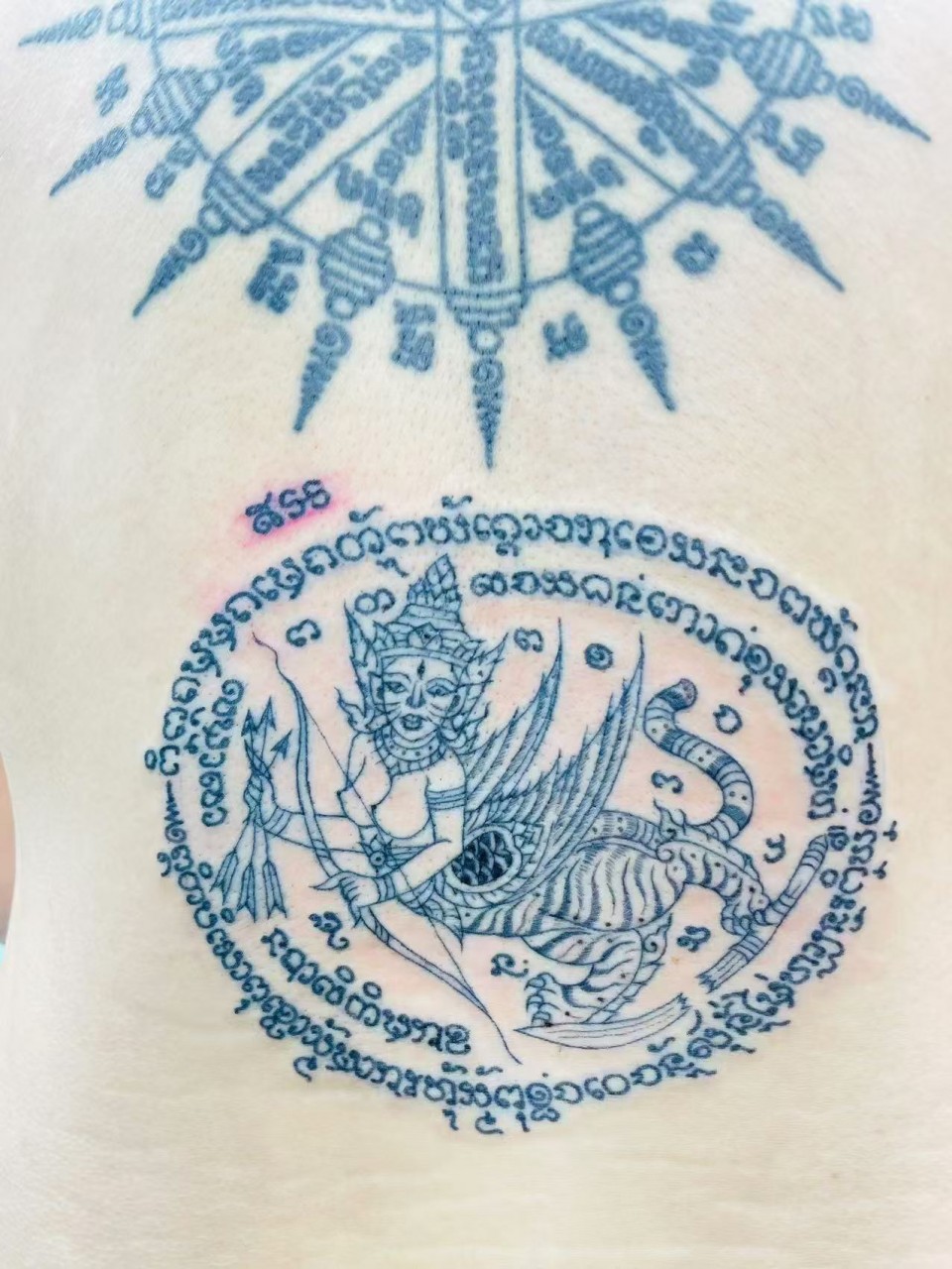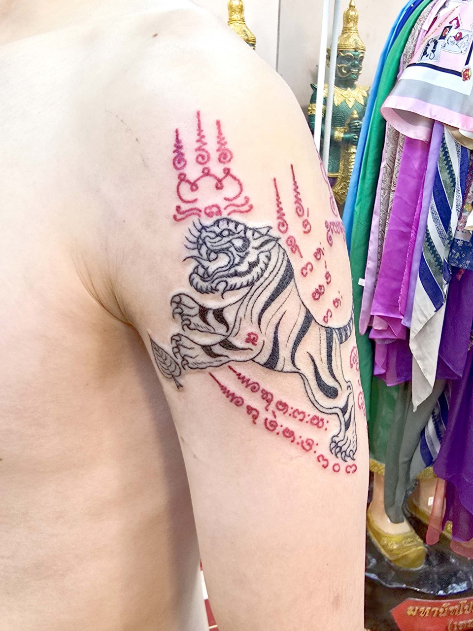 無身虎{又稱對頭虎 / 藏身虎},沒有身體的無身老虎任何邪師黑巫師想對你動手都無從入手,無身虎又稱隱身虎,對方想落你降頭都無辦法搵到你,意思是刺符無身虎等同令你有匿踪能力,無人對付到你。同時這符印適合靠〝口才〞工作或做生意的善信,讓善信可以在說話時更具吸引力和說服力,也具有出人頭地的意思。這圖印可加強個人魅力、權威、領導能力、可以幫助善信看清正面及背面的敵人、帶來無比幸運、增強權力及自信。