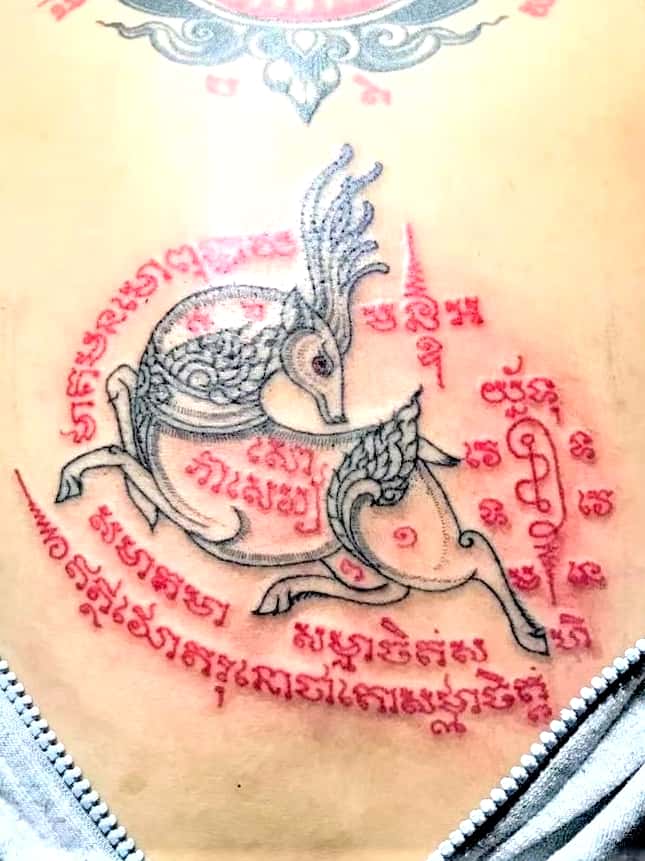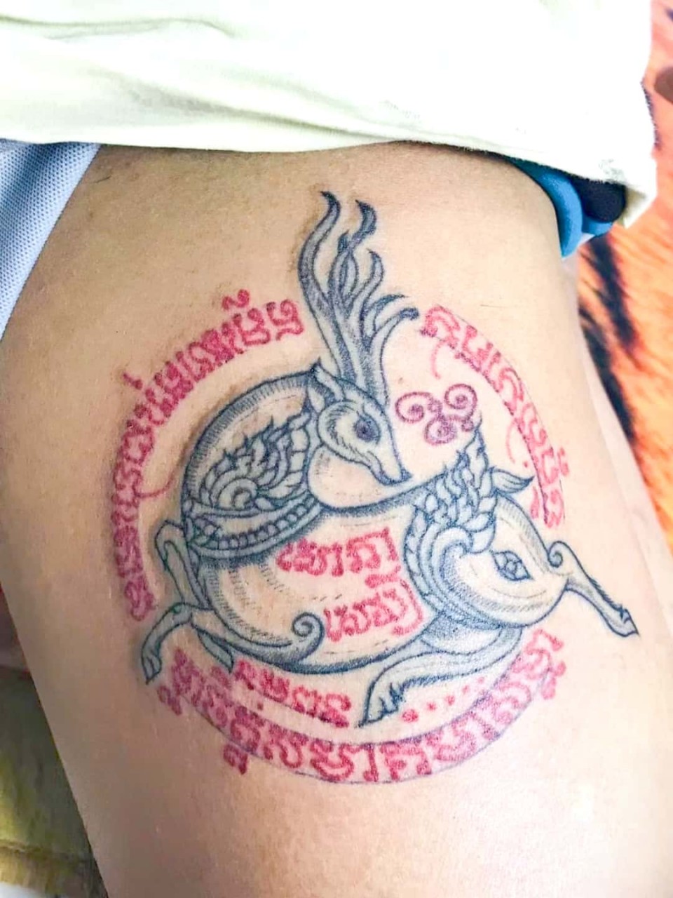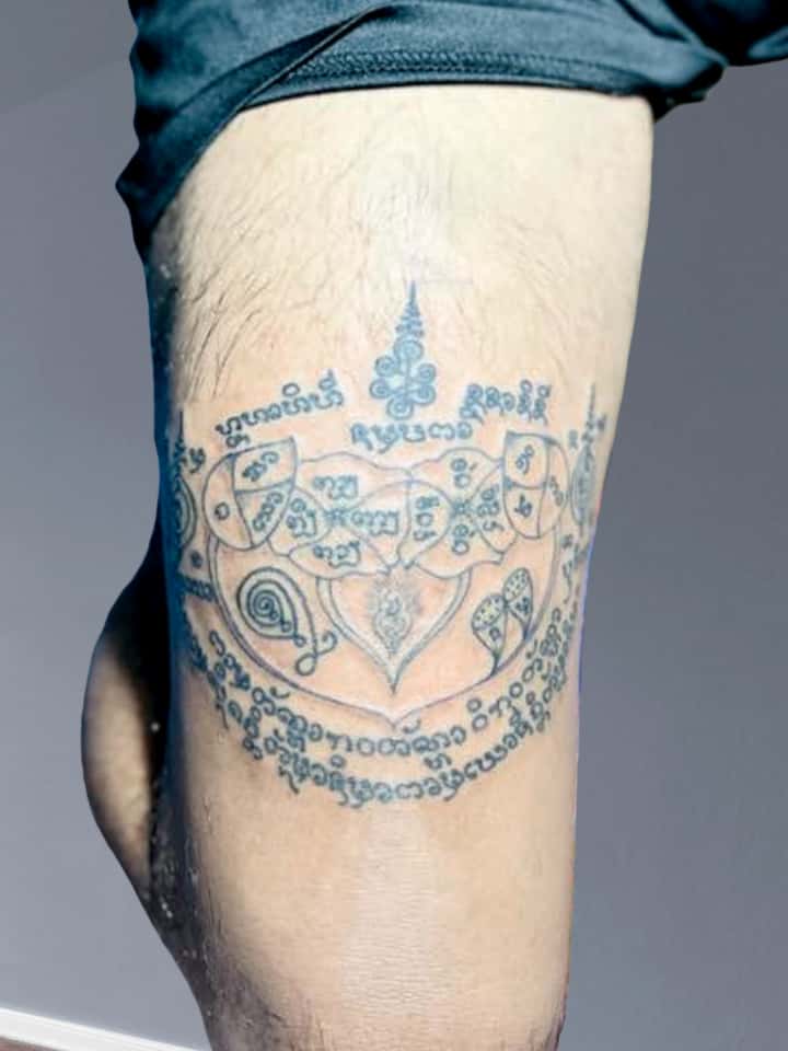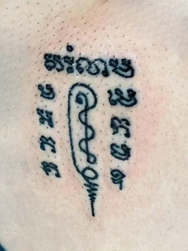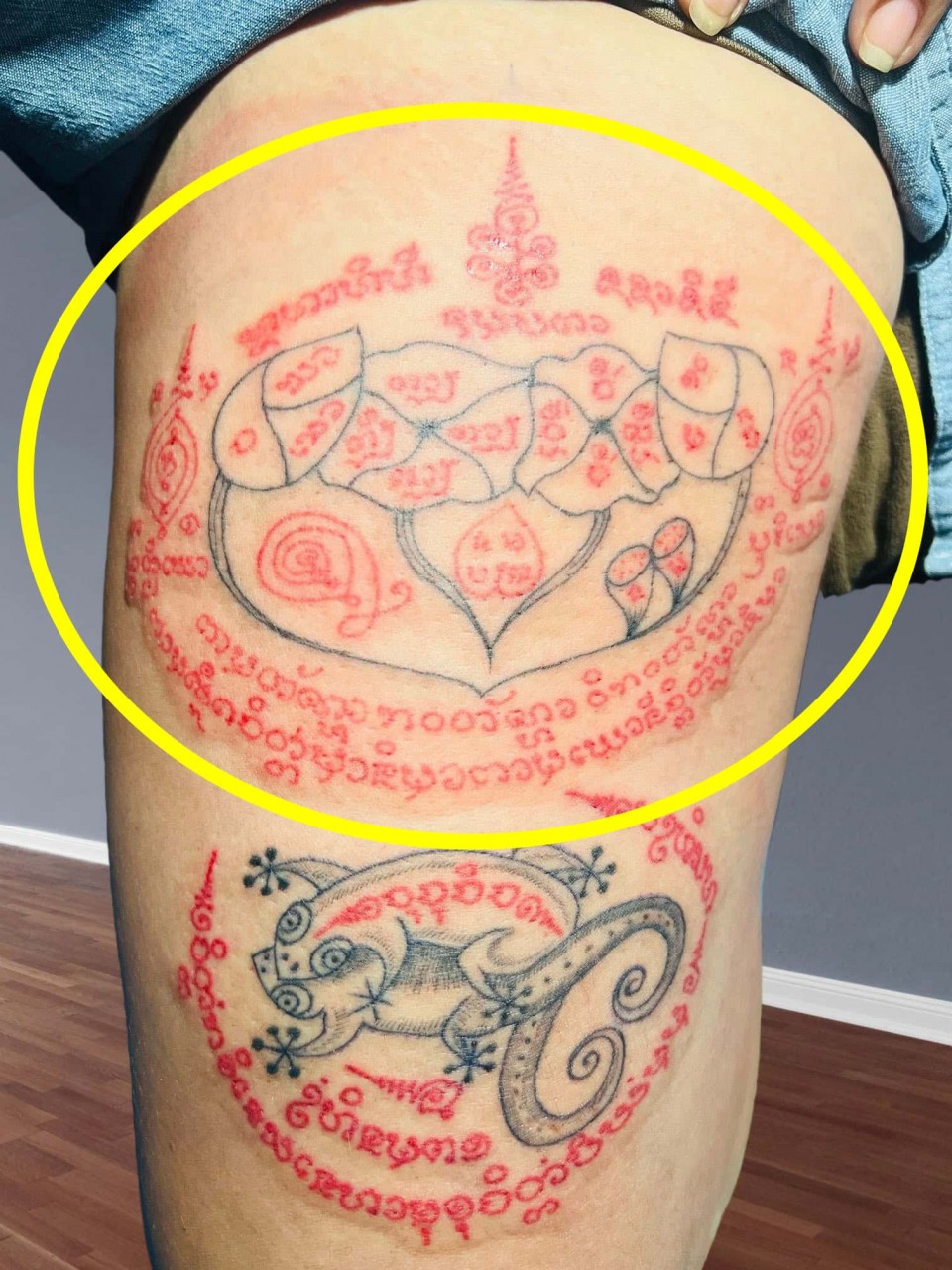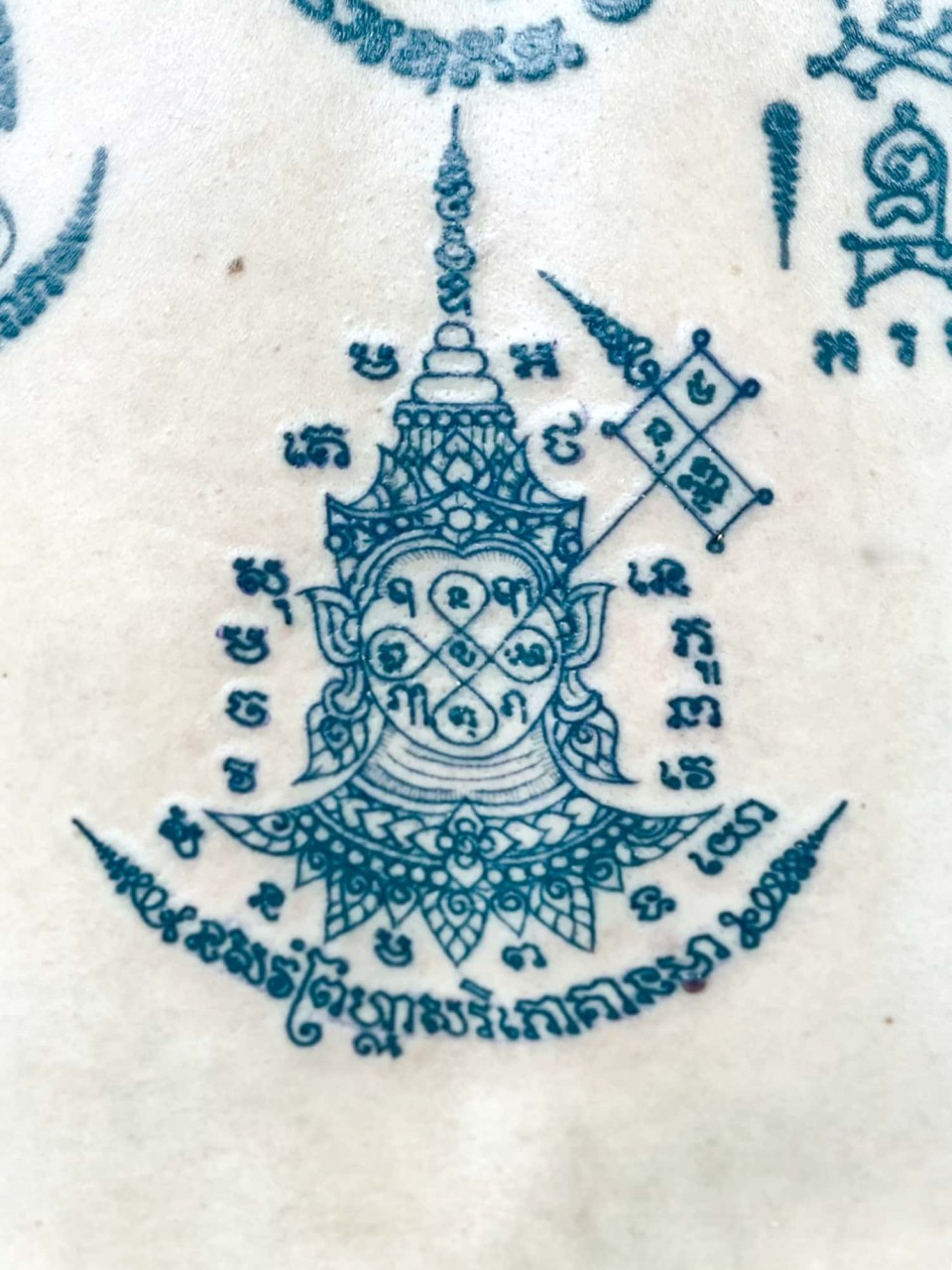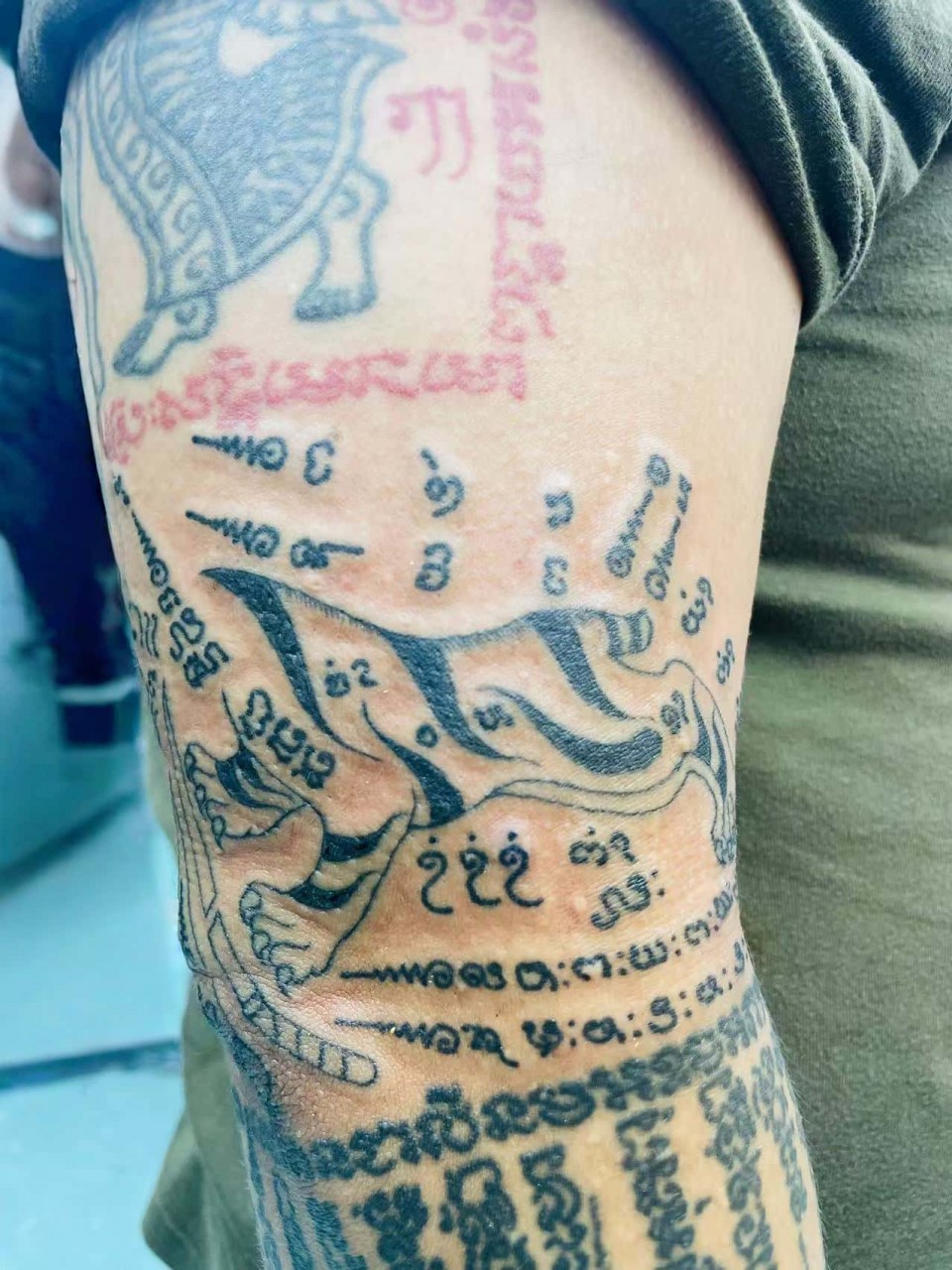無身虎{又稱對頭虎 / 藏身虎},沒有身體的無身老虎任何邪師黑巫師想對你動手都無從入手,無身虎又稱隱身虎,對方想落你降頭都無辦法搵到你,意思是刺符無身虎等同令你有匿踪能力,無人對付到你。同時這符印適合靠〝口才〞工作或做生意的善信,讓善信可以在說話時更具吸引力和說服力,也具有出人頭地的意思。這圖印可加強個人魅力、權威、領導能力、可以幫助善信看清正面及背面的敵人、帶來無比幸運、增強權力及自信。