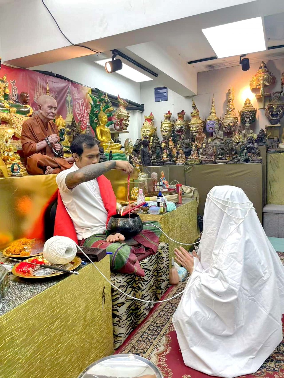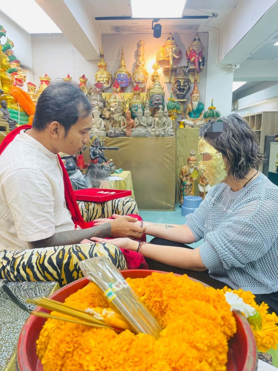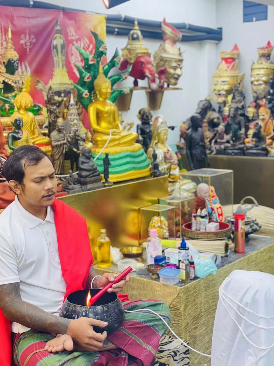 如善信家中設有泰國佛壇,師傅會用最正統的儀式誦經請天神到位能幫忙善信家中的佛壇上的天神令佛壇上的供奉型能夠在參拜時有天神到臨,並會教導善信佛壇上的正確擺放和注意的地方 唸經同時會開光加持一盤聖水 為善信家中用聖水灑淨 餘下的聖水善信可用作沖洗身上的霉運