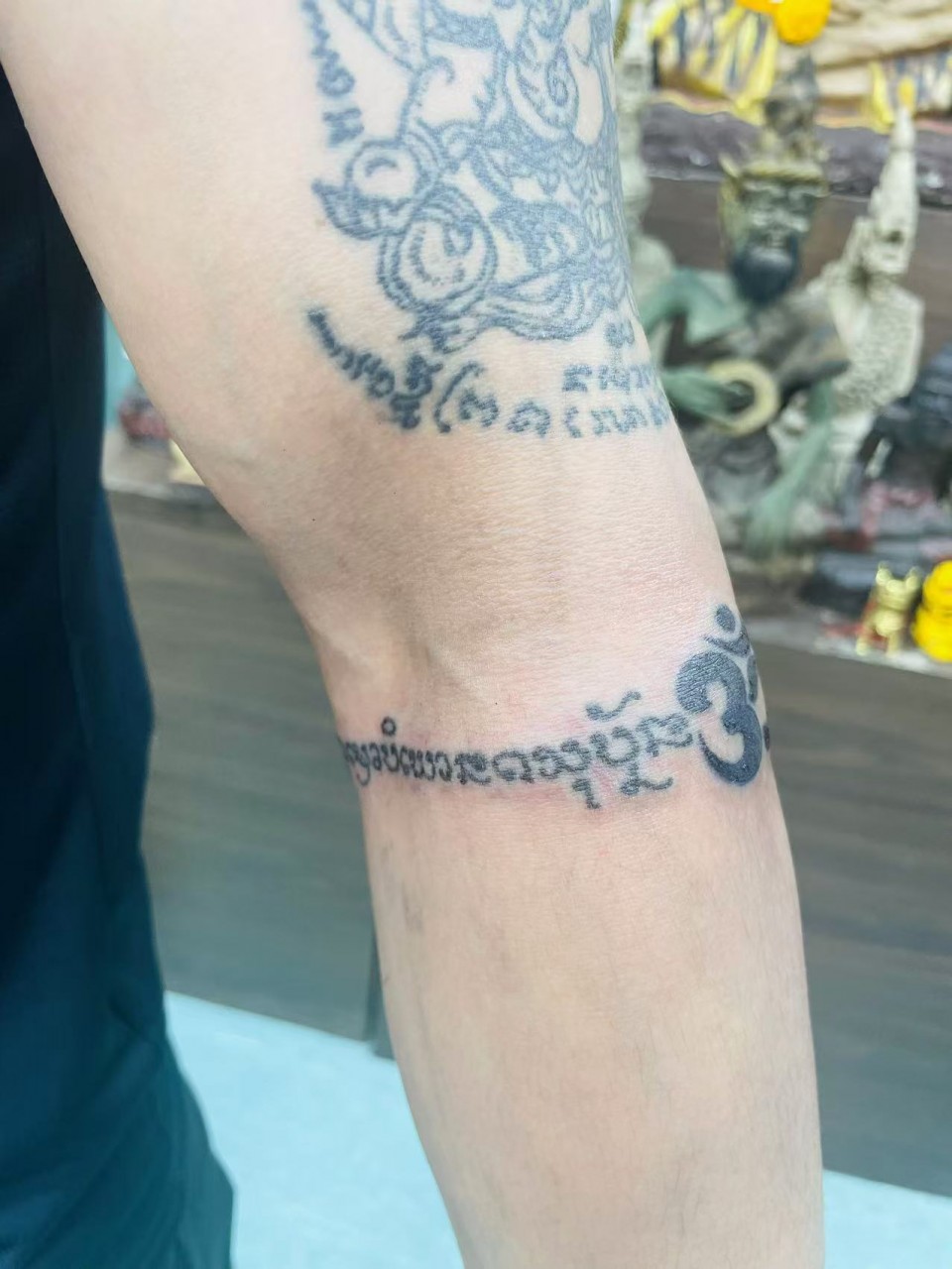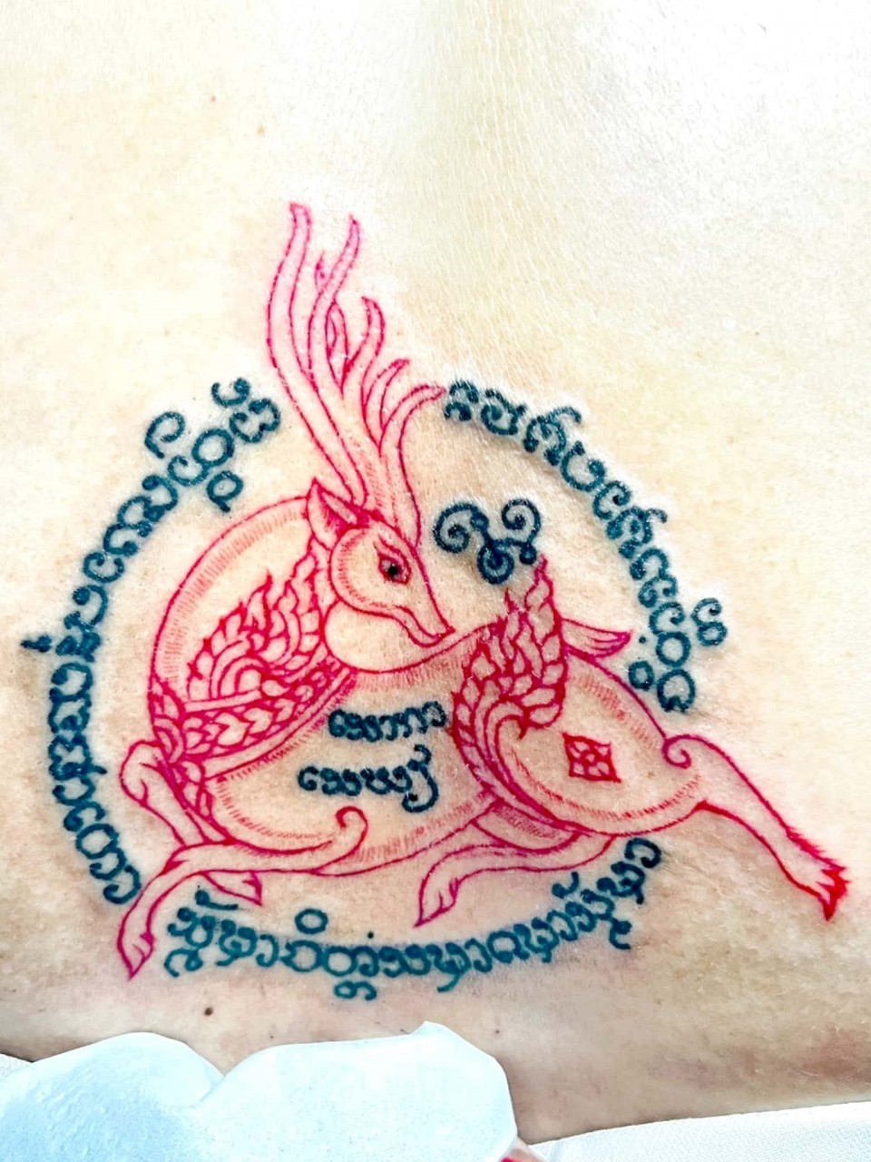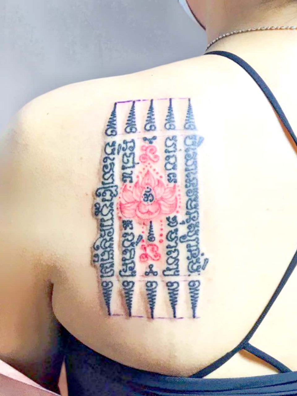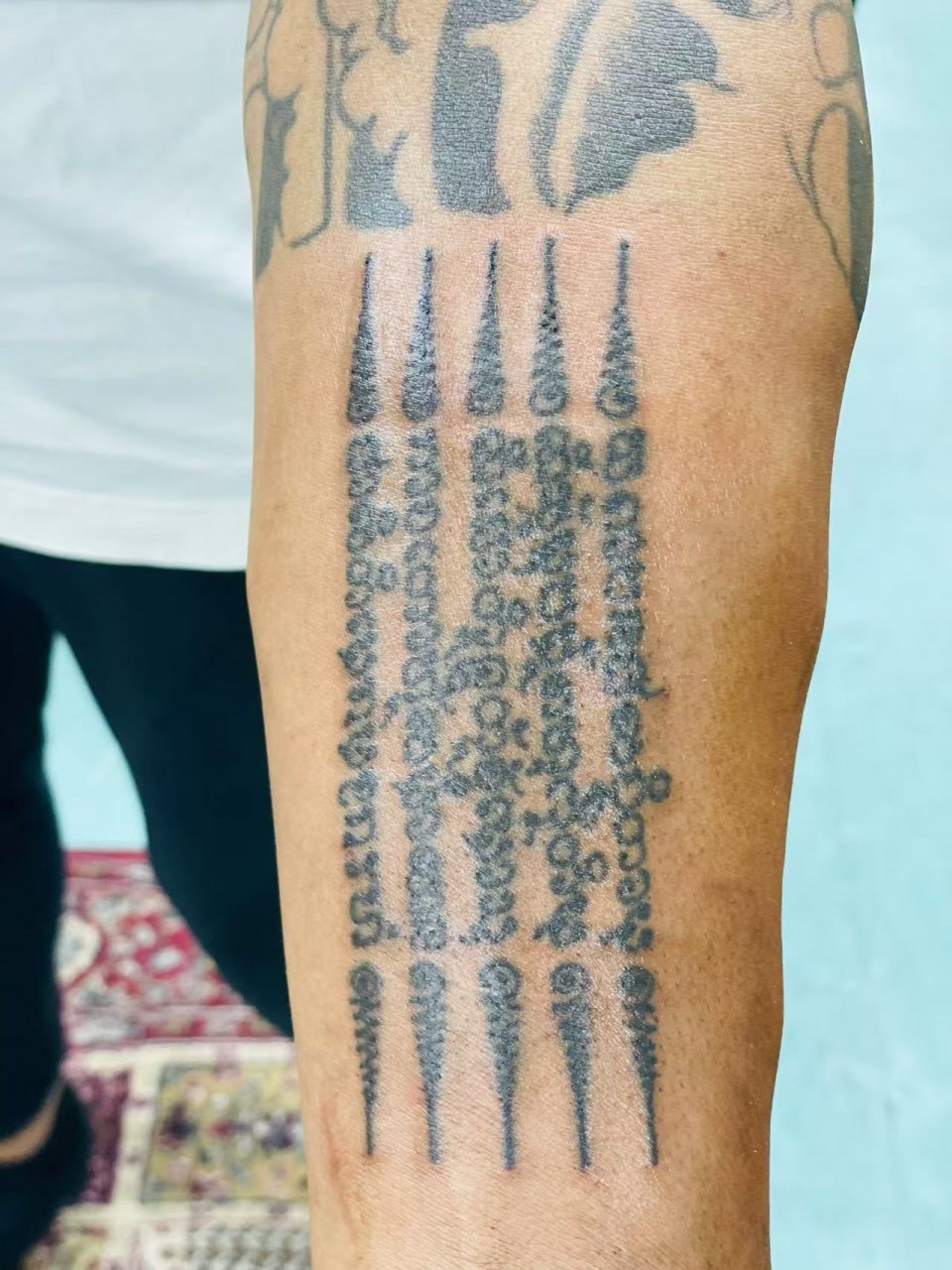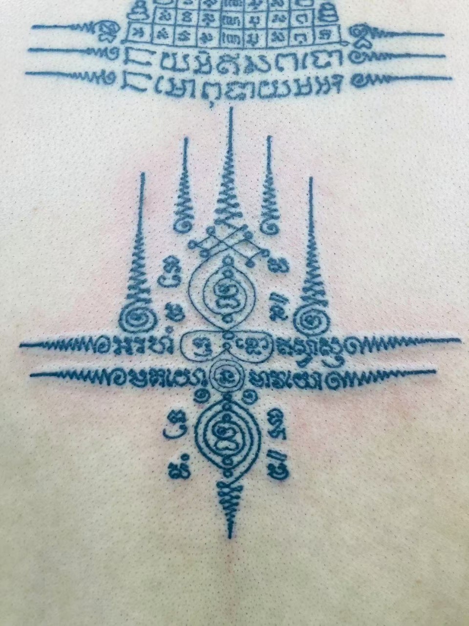 善信可以選擇油刺(透明無色)或 有色刺符,油刺(透明無色)是用古法金針在身上刺上符印,只是金針上不沾墨水,是使用法油刺上,所以刺出來圖印和符印都是沒有顏色的 ,所有刺符無論有色或油刺(透明無色),整個過程和功效都是完全一樣的,刺符不論是有色或無色都是永久有效的