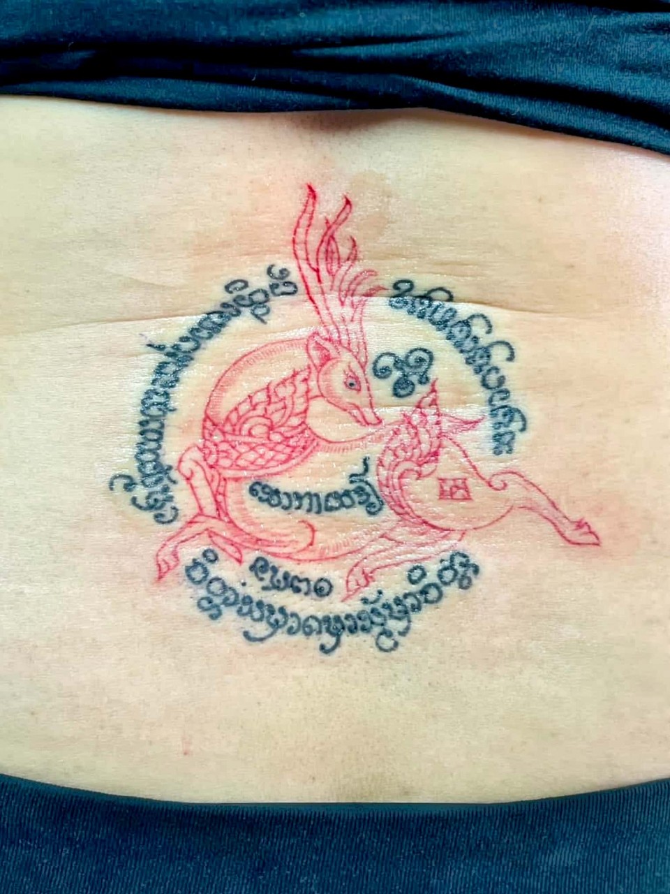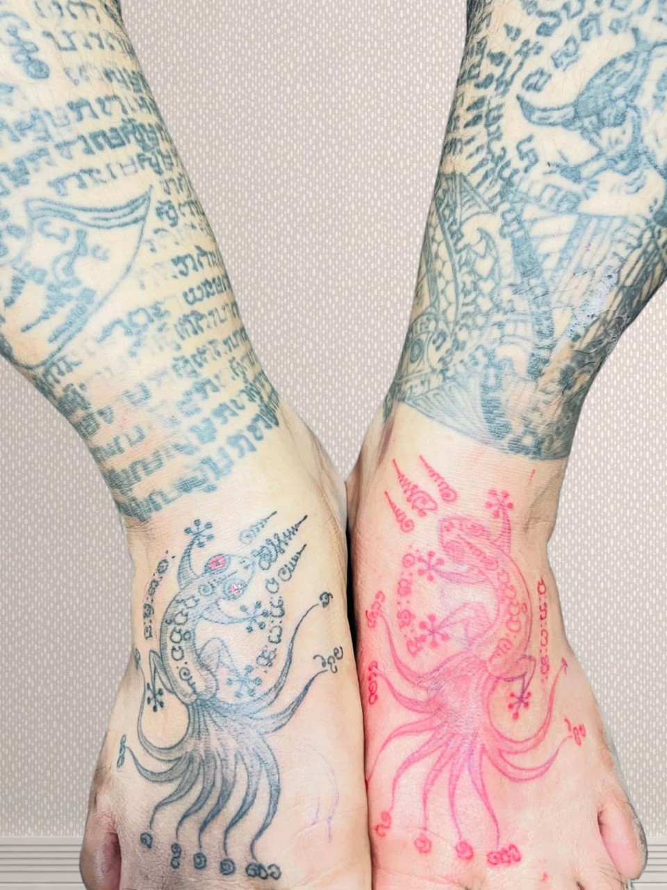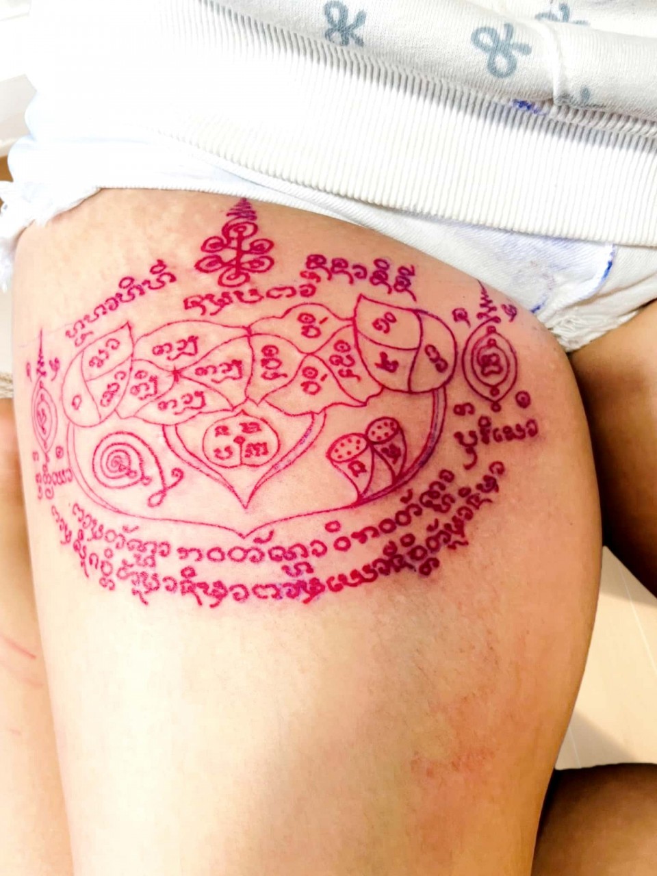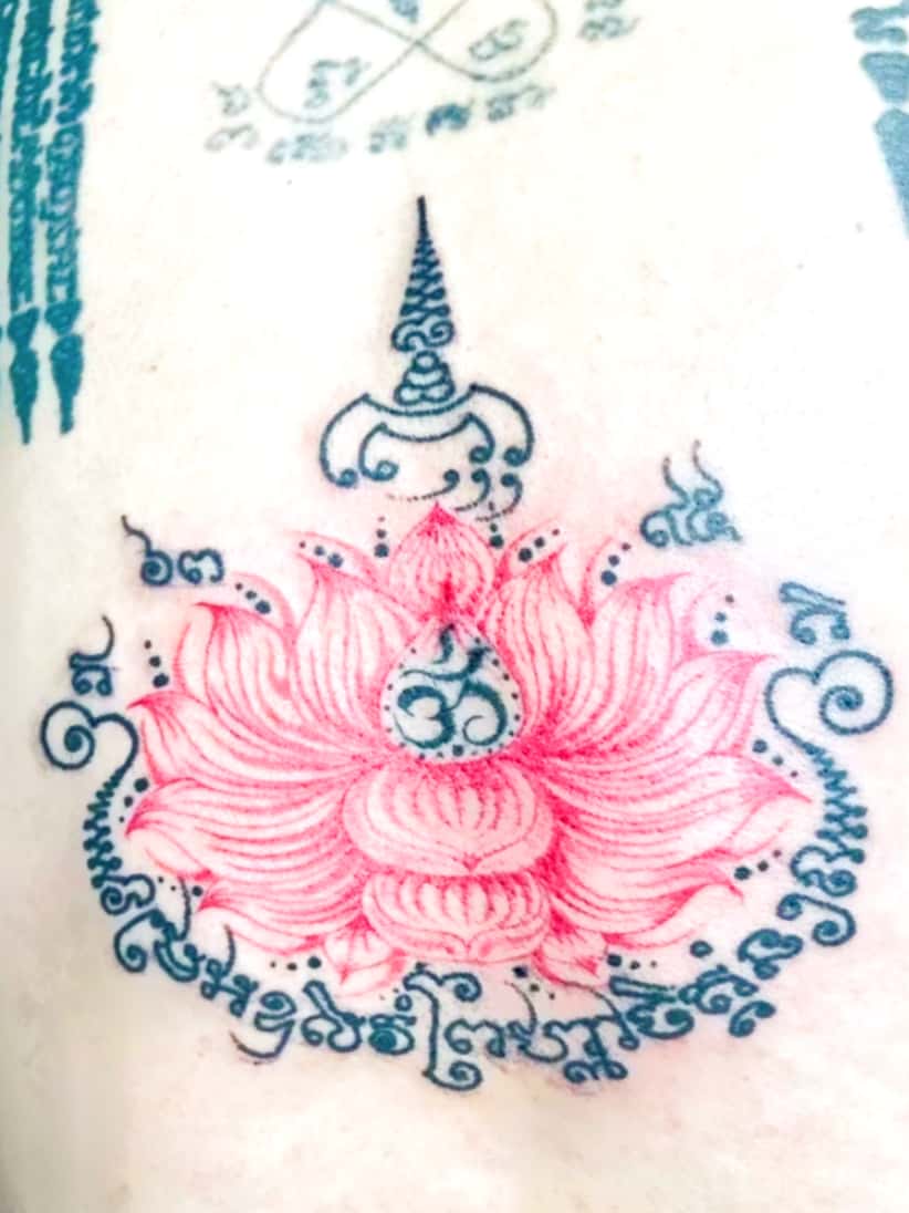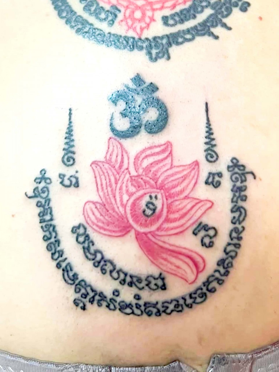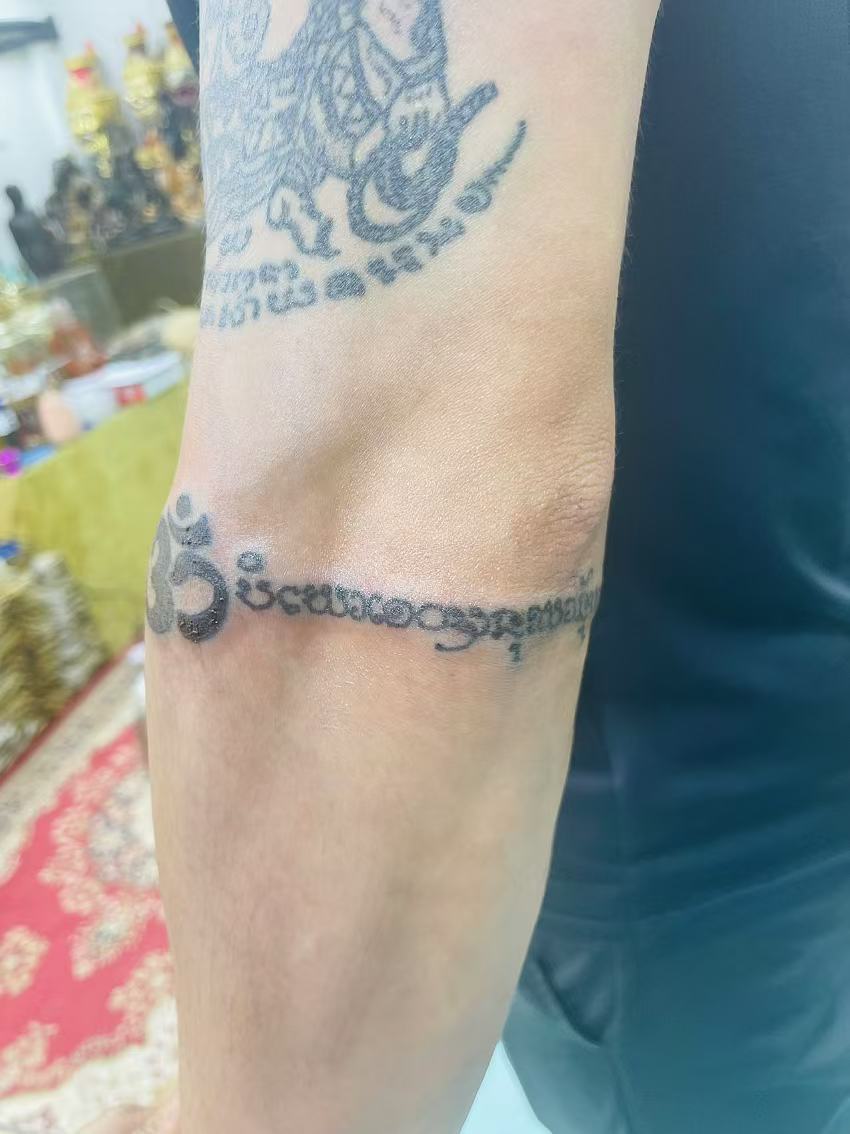 善信可以選擇油刺(透明無色)或 有色刺符,油刺(透明無色)是用古法金針在身上刺上符印,只是金針上不沾墨水,是使用法油刺上,所以刺出來圖印和符印都是沒有顏色的 ,所有刺符無論有色或油刺(透明無色),整個過程和功效都是完全一樣的,刺符不論是有色或無色都是永久有效的