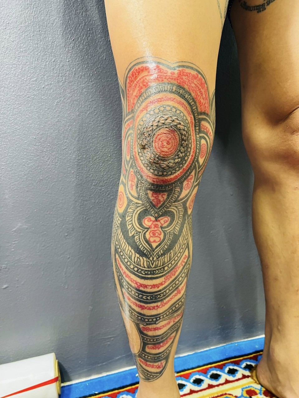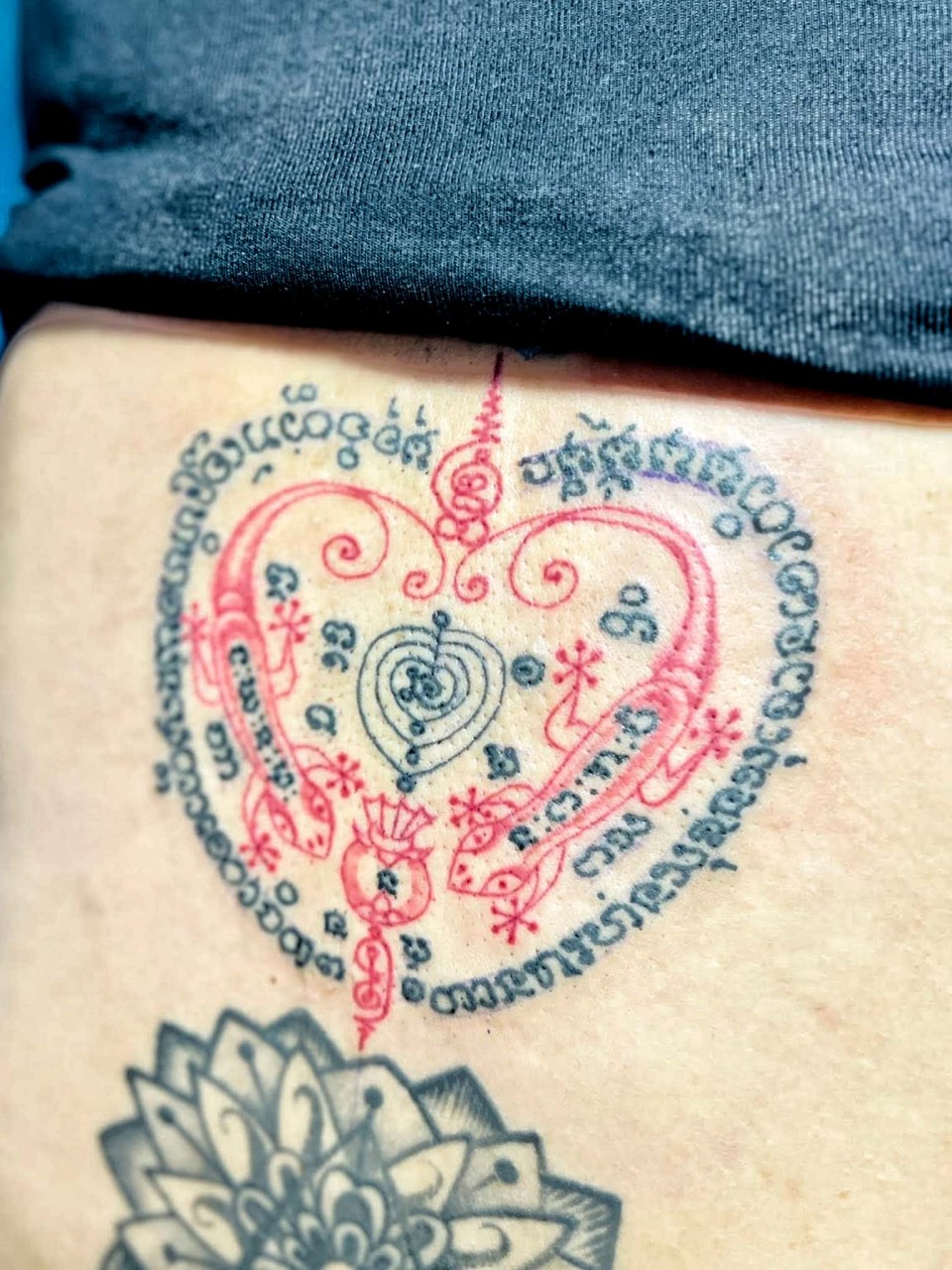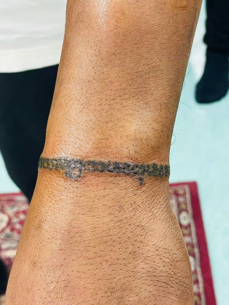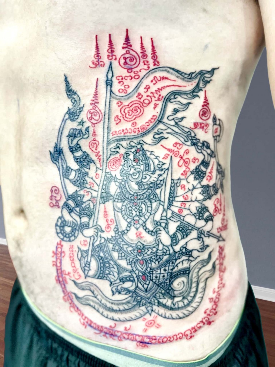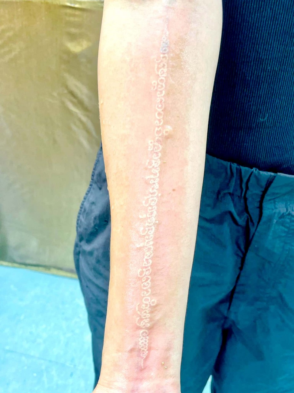 善信可以選擇油刺(透明無色)或 有色刺符,油刺(透明無色)是用古法金針在身上刺上符印,只是金針上不沾墨水,是使用法油刺上,所以刺出來圖印和符印都是沒有顏色的 ,所有刺符無論有色或油刺(透明無色),整個過程和功效都是完全一樣的,刺符不論是有色或無色都是永久有效的
