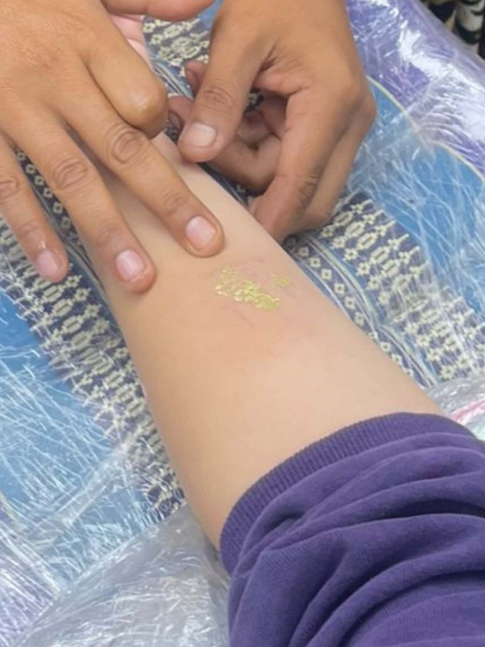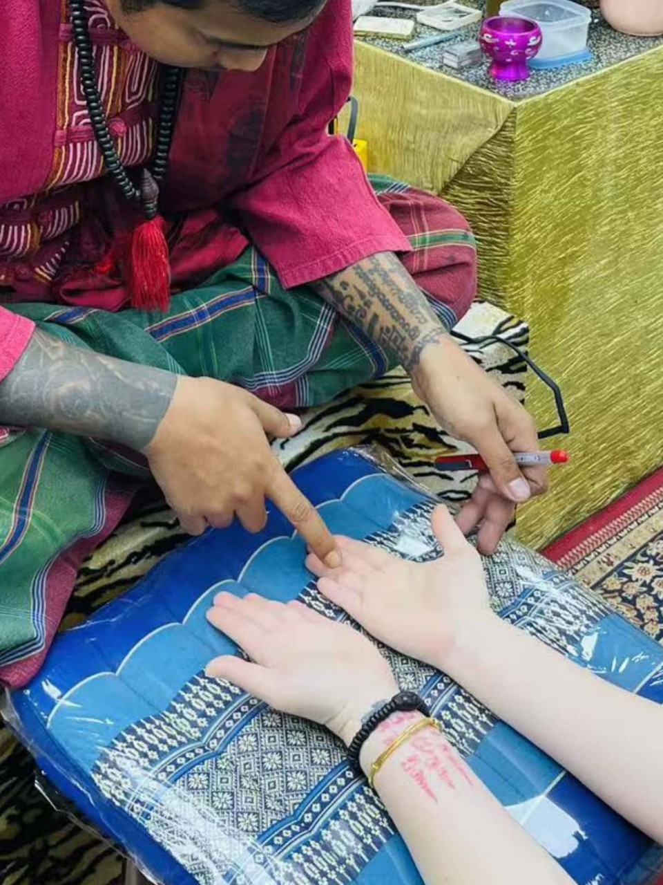 (依個法事師傅用獨有既法油為善信手掌刺上掌紋,刺上後係透明無顏色)