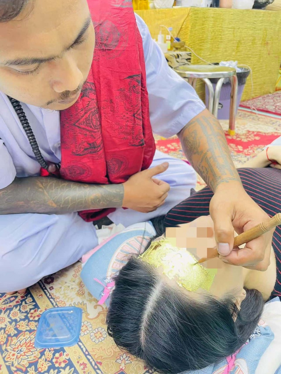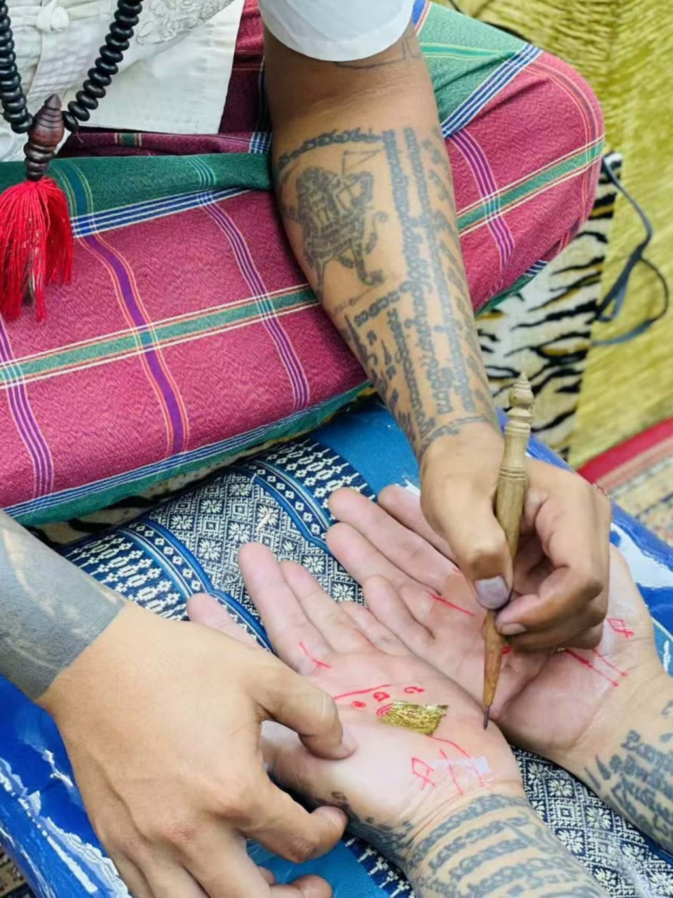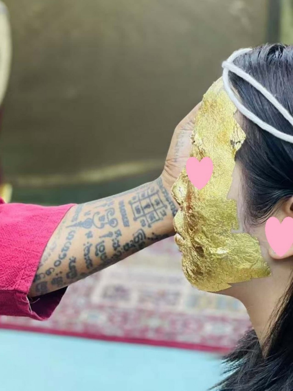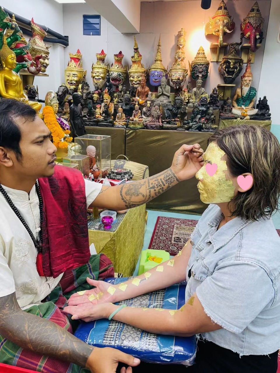 每片金箔都是泰國真金製成,都經過師傅開光加持。師傅會用他們獨有的人緣油或人緣膏塗抹到善信的身上,再因應善信貼金的數量貼上相應的金箔,師傅再將符咒畫到金箔上,金箔便會溶到善信的體內,師傅劃在金箔上的符咒經文也隨之加到善信身上