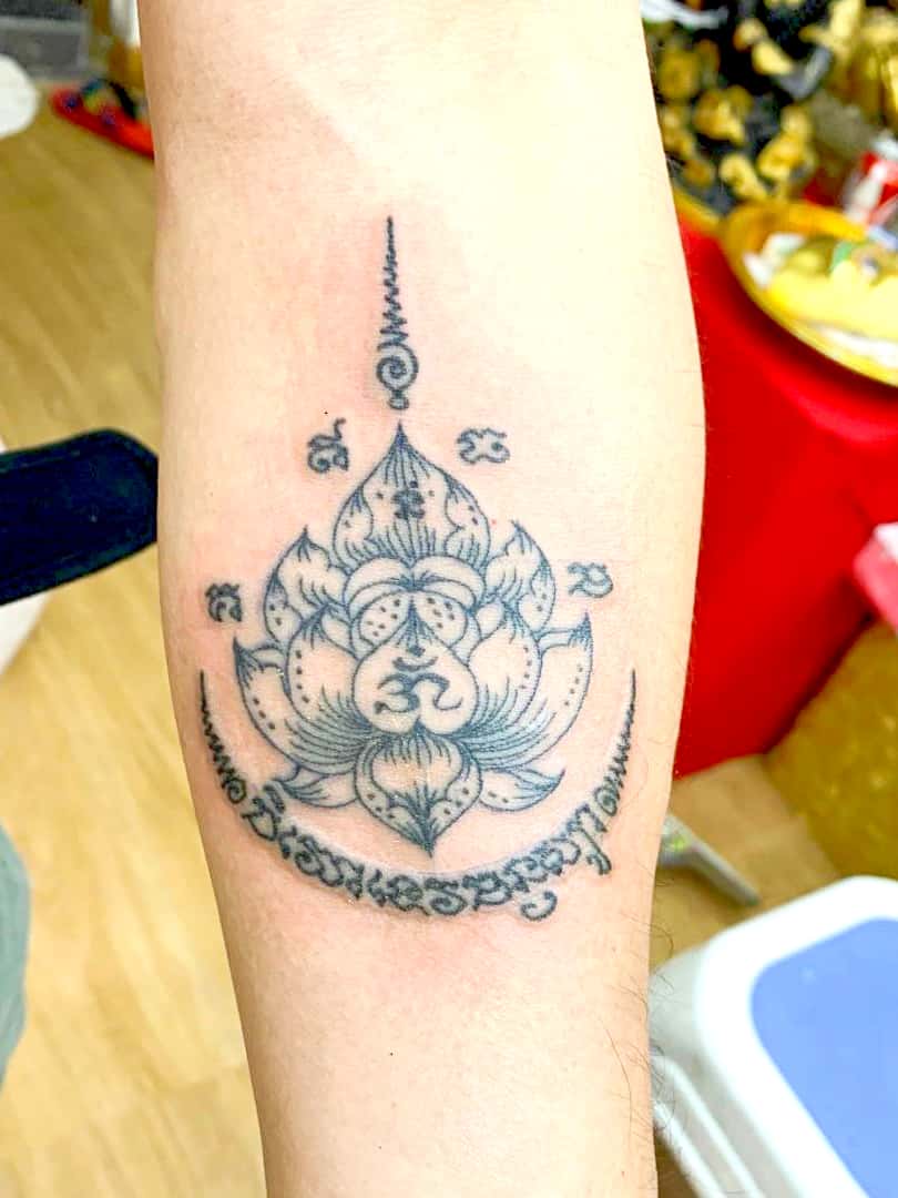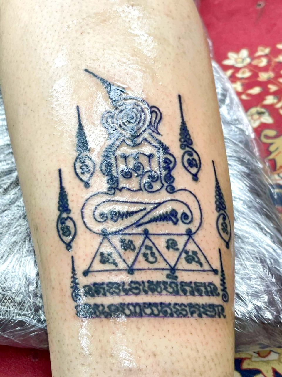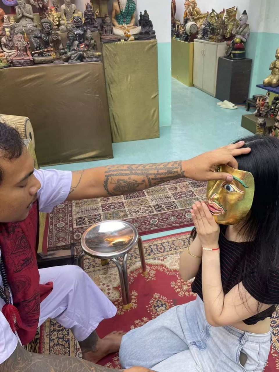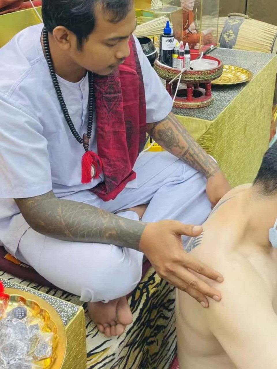 每片金箔都是泰國真金製成,都經過師傅開光加持。師傅會用他們獨有的人緣油或人緣膏塗抹到善信的身上,再因應善信貼金的數量貼上相應的金箔,師傅再將符咒畫到金箔上,金箔便會溶到善信的體內,師傅劃在金箔上的符咒經文也隨之加到善信身上