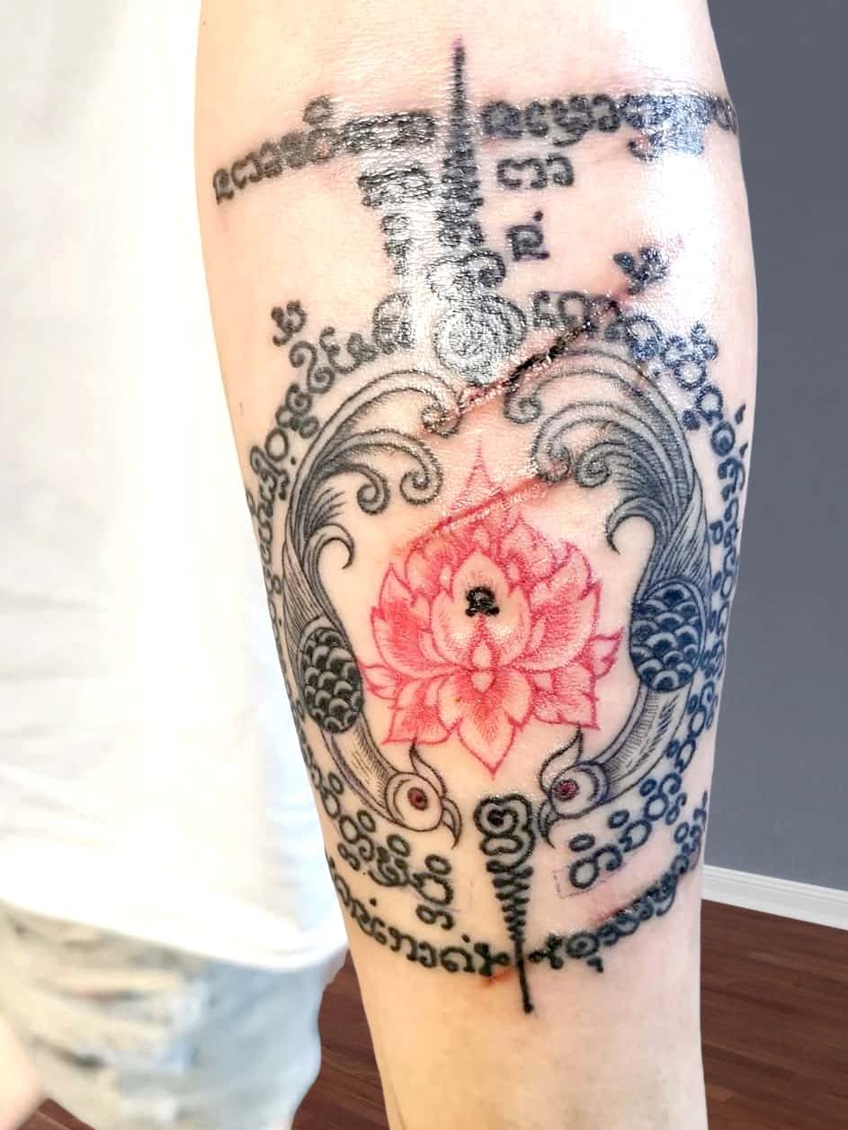 鯉魚生命力強大,能在湍急的河流中逆流而上,傳統上鯉魚象徵生命力頑強,不畏艱難一鼓作氣勇往直前,而師傅在招財鯉魚圖印用上了招財法門,刺上招財鯉魚圖印能為善信帶來財運、橫財運和偏財運,提升善信的整體運氣,無論工作事業和生活上各方面都能帶來好運,容易得到貴人扶持,讓善信在工作事業和生活上順順利利