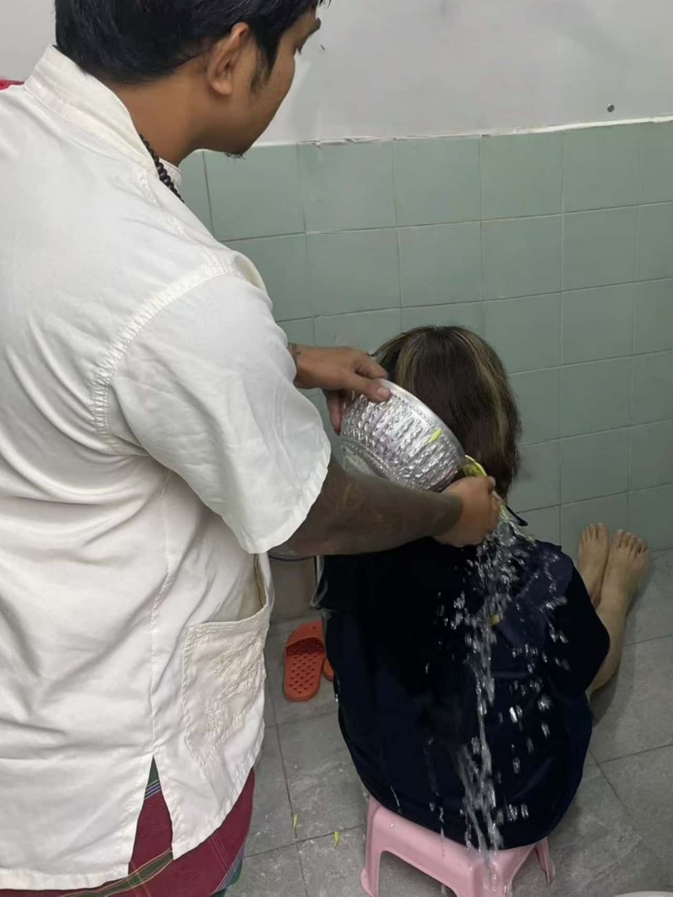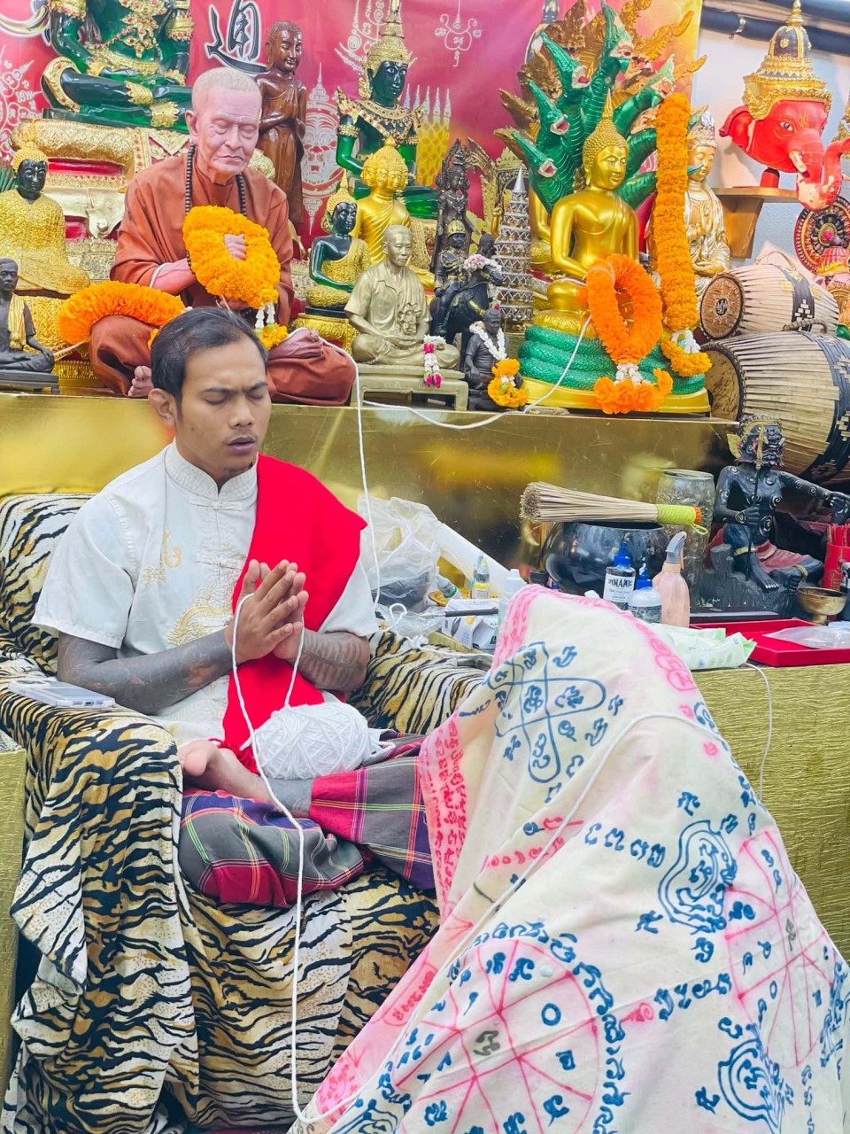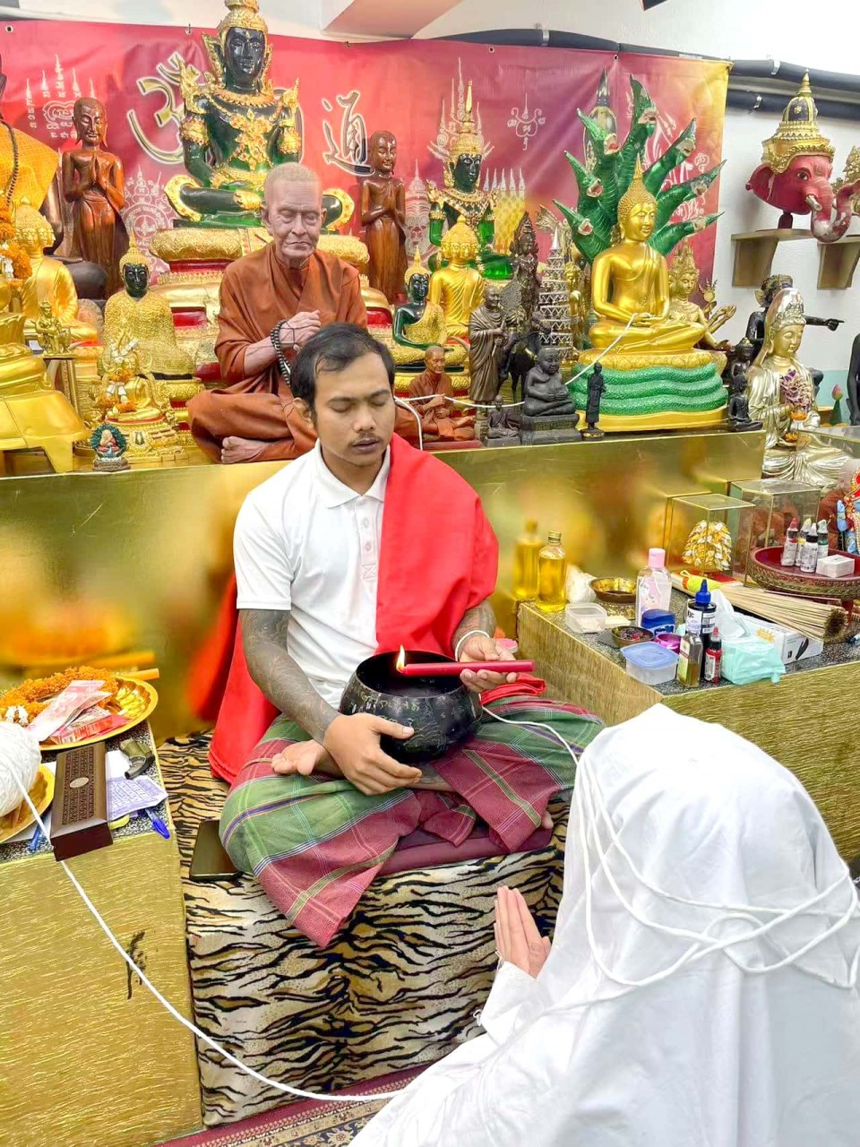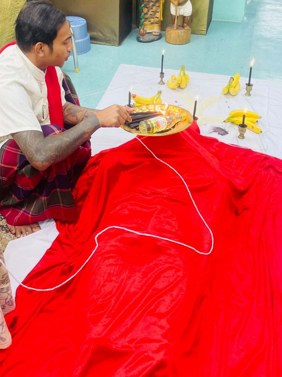 最後師傅將紅布蓋在善信身上,然後阿贊堆師傅會持續唸頌經咒一段時間,然後再點燃蠟燭繼續持頌經咒,並將蠟燭吹向善信的紅布上,意思是把善信身上不好的霉氣、衰運徹徹底底地全部吹走,並提升善信的整體氣場和運氣