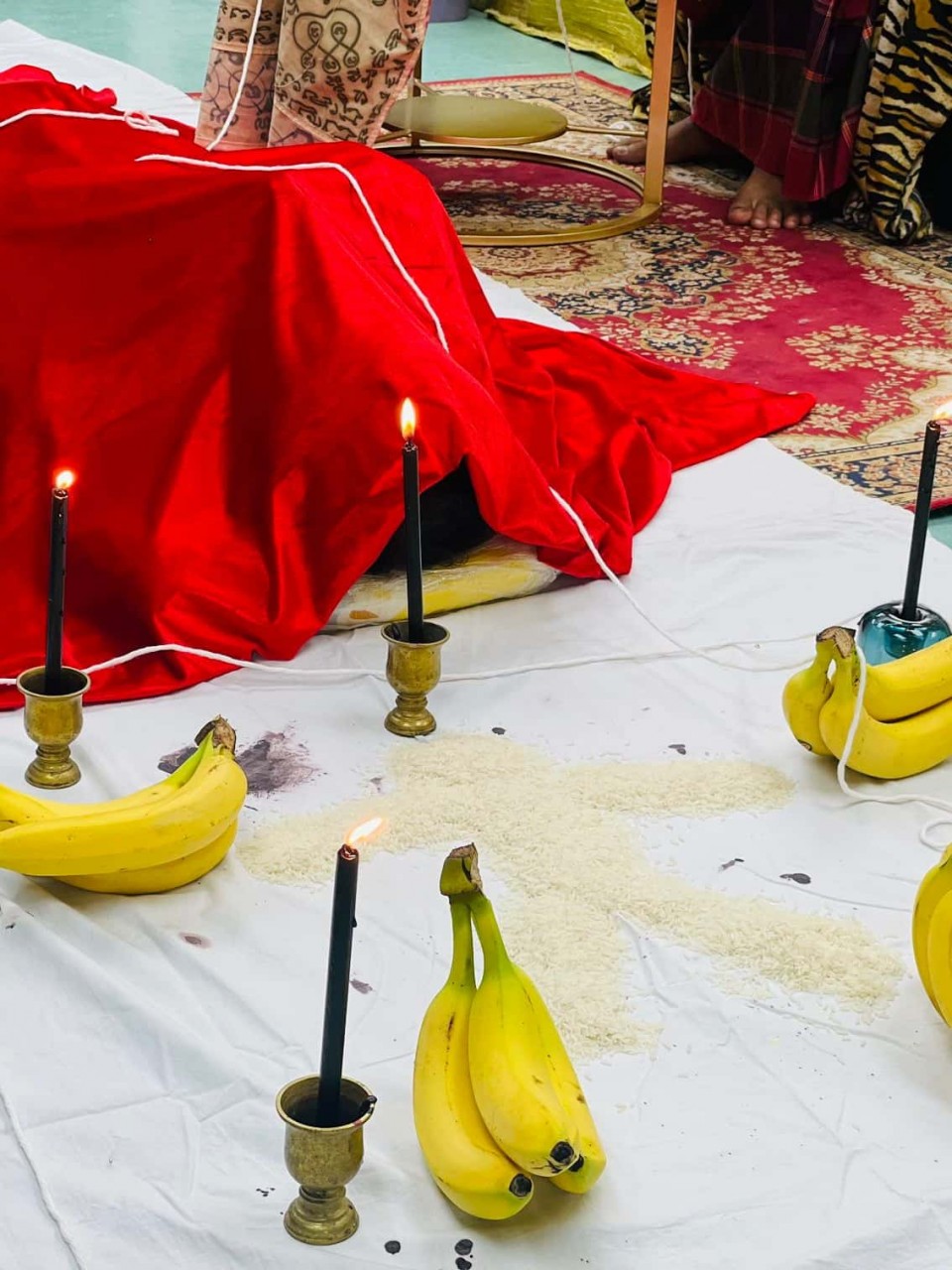 註:善信需要準確好指定的供品如:雞鴨豬鮮花生果(因每位善信家中供奉的天神有所不同所需的供品都不相同)而師傅誦經時善信家人同時可以用連接師傅的經線一同加持