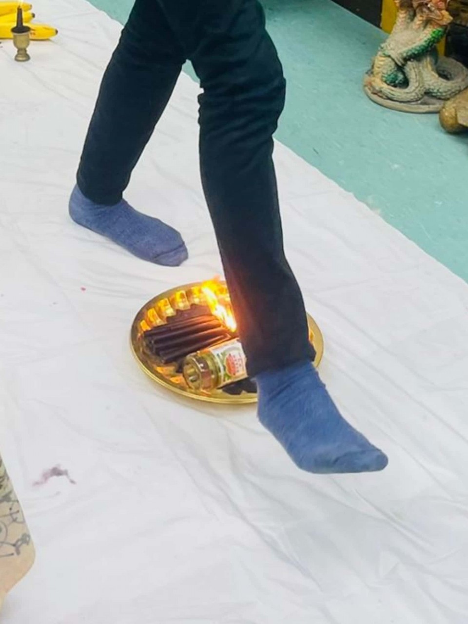 (如本年是犯太歲者很多時會是諸事不順,頭頭碰著黑,亦很易會破財及會發生不必要的損傷,拉胡轉運法事會把不順利的衰運及霉氣將之除去,希望在犯太歲的年份不會惡運纏身,能夠事事順利),然後師傅會在盤子上放上蠟燭和鮮花一支白酒,並將蠟燭點燃放置盤上,然後善信需要來回跨越這個火盤(跨越火盤次數依據善信的年齡而定),以便清除身上的霉運和衰氣