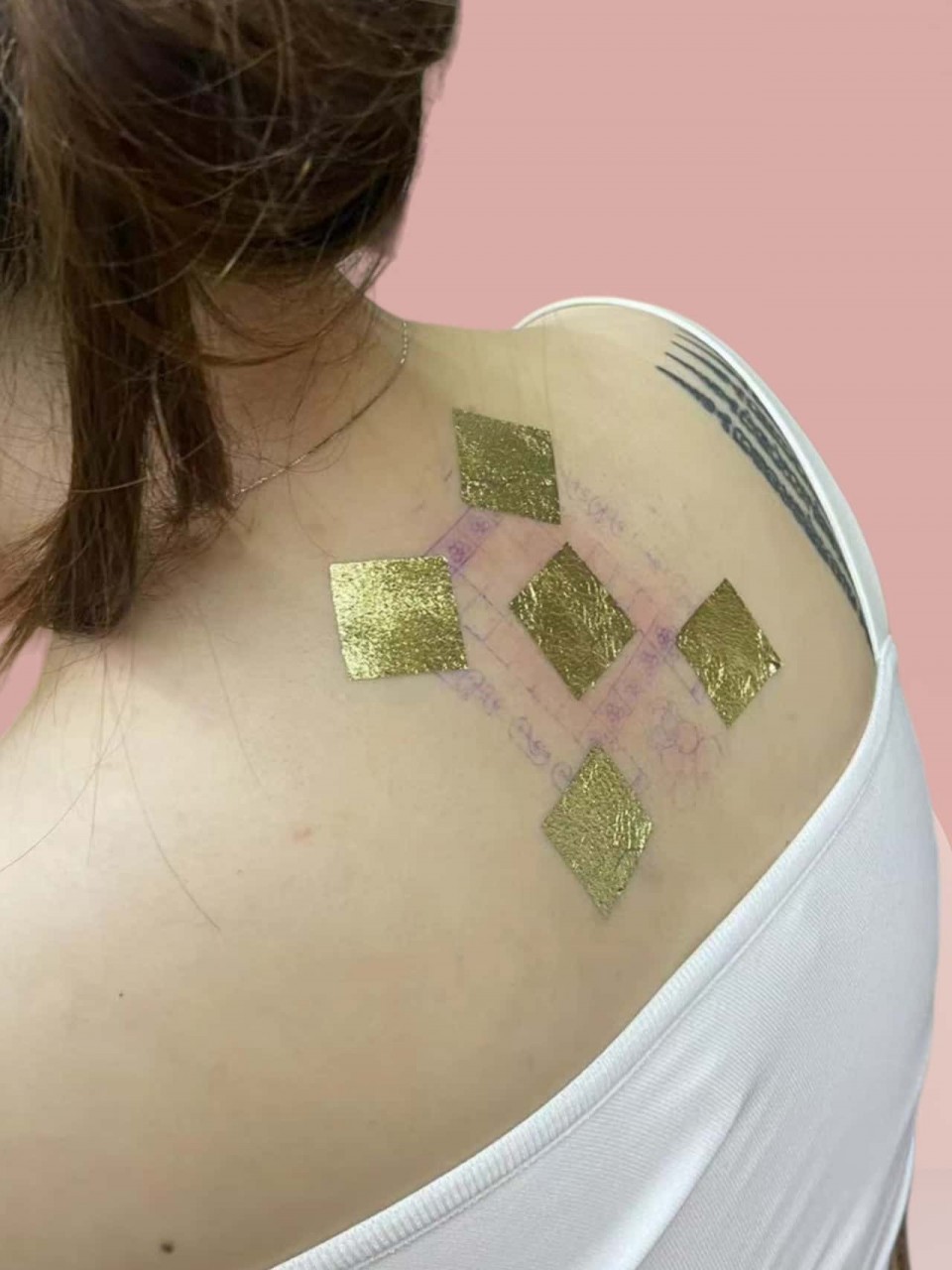每片金箔都是泰國真金製成,都經過師傅開光加持。師傅會用他們獨有的人緣油或人緣膏塗抹到善信的身上,再因應善信貼金的數量貼上相應的金箔,師傅再將符咒畫到金箔上,金箔便會溶到善信的體內,師傅劃在金箔上的符咒經文也隨之加到善信身上。