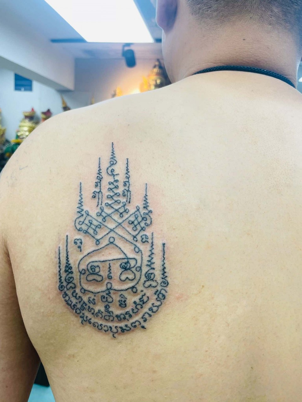 婆代師公親傳超強經文刺符 Yant Racha Nang BangLang,皇帝坐皇座經文,經文功效提升善信的威嚴與氣勢,提升權威權力權勢,令你高高在上,說話更有說服力,萬人景仰,沒有人敢逆你意,所以人都要聽候你的命令和差遣,就像皇帝一樣,這個符印適合做老闆,做生意,做買賣,做銷售,時常在外交際的人,做起事來像皇帝一樣所有下屬都會聽你話,你會受到所有人尊重,並招來好運氣,提升善信財運(招正財),你既生意會越做越大,吸引錢財到你手上,招來更多顧客,令你富貴榮華,永不挨餓、永不缺財、不愁衣食,這個符印男女都可以刺上