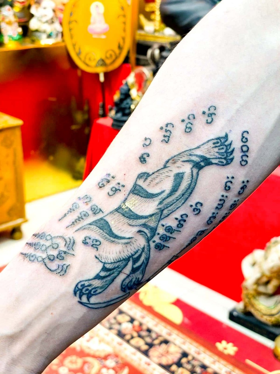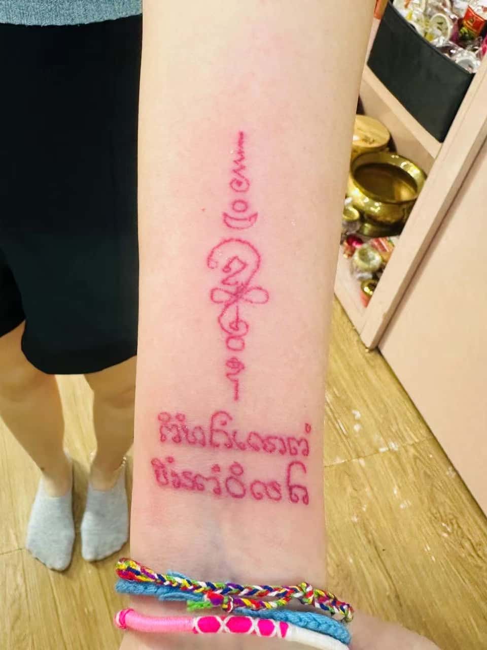 阿贊巔排龍師傅為所有善信刺上這個【印拖重龍門】佛祖庇佑符印,必需要向師公婆代進行一個非常嚴謹的拜師儀式,代表著成為阿贊婆代邦斌的徒弟,就會得到這符印最大的功效作用、得到祖師爺庇佑,而拜師儀式需要的費用已包含在刺符的價格內,師傅一回到泰國 就會代替善信向婆代師公進行拜師儀式