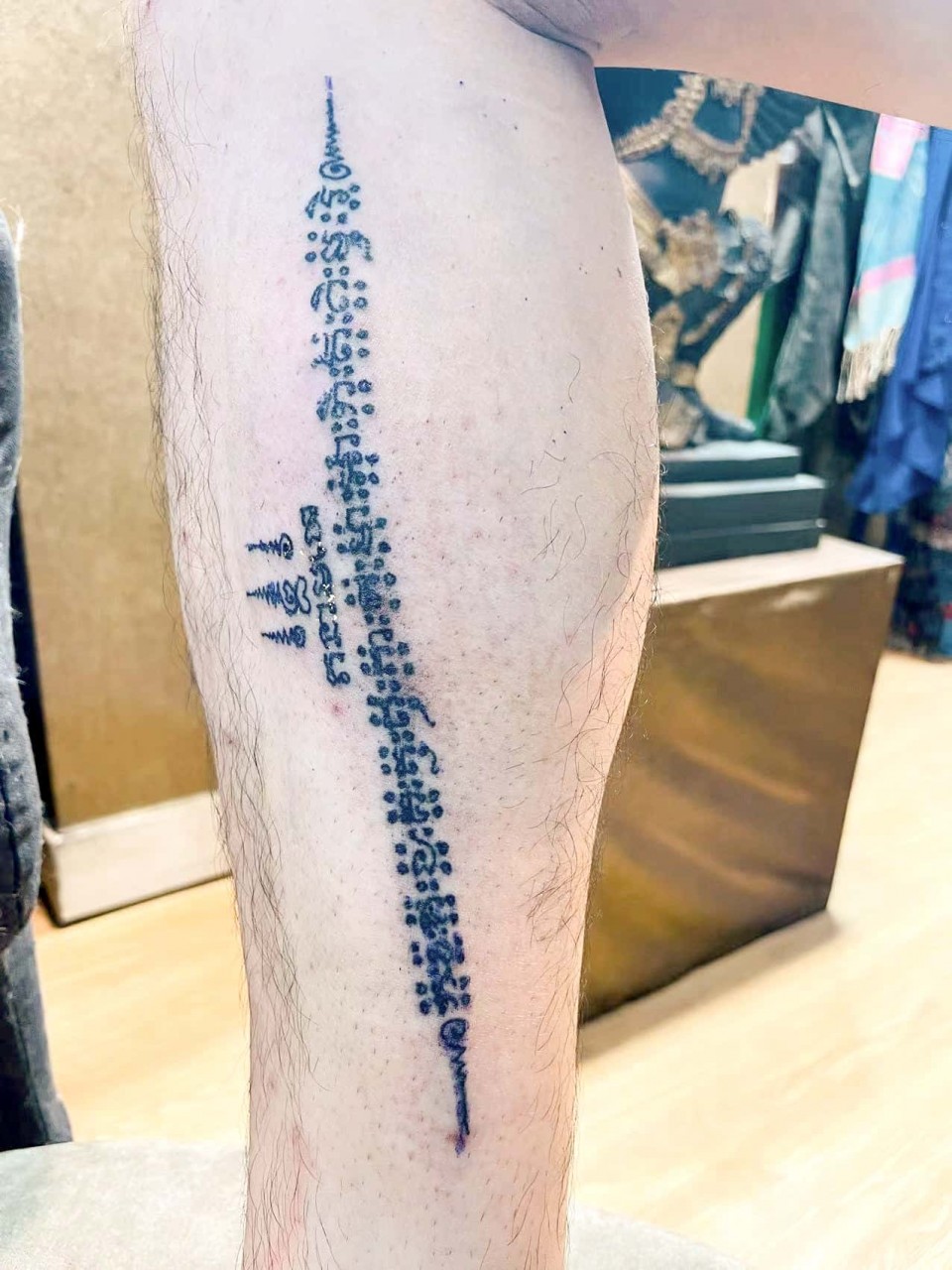 阿贊巔排龍師傅為所有善信刺上這個【印播斑吔】蓮花符印,必需要向師公婆代進行一個非常嚴謹的拜師儀式,代表著成為阿贊婆代邦斌的徒弟,就會得到這符印最大的功效作用、得到祖師爺庇佑,而拜師儀式需要的費用已包含在刺符的價格內,師傅一回到泰國 就會代替善信向婆代師公進行拜師儀式