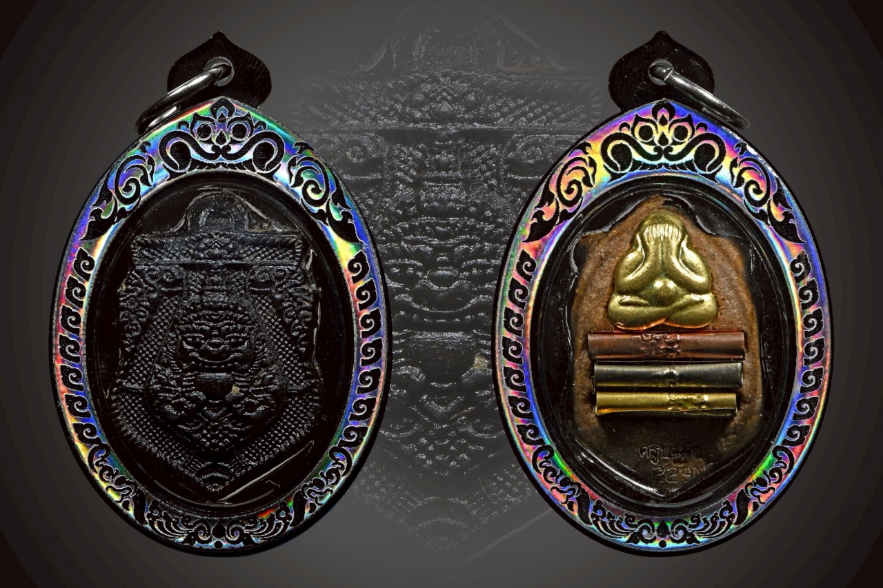 材料 : 這拉胡佛牌材料就是用罕有的單眼椰子殼作材料 雕刻師在單眼椰子殼上刻上拉胡天神法相 而佛牌背後有必打佛 及金銀銅符通