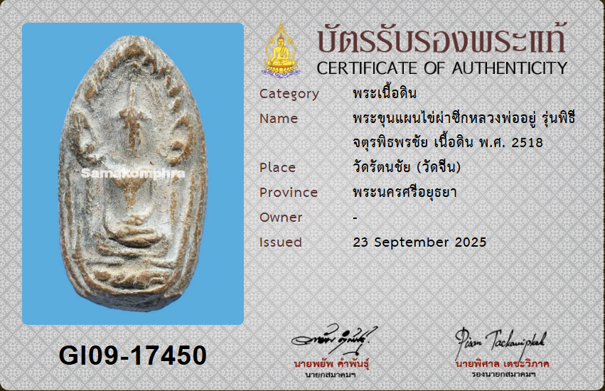 佛曆 : 於2518 在Wat Rattaanachai 由當時期全泰三大高僧為首 有Wat Kositaram龍婆貴、Wat Sakae龍普Doo、崇迪王Wat Pikulthong龍婆培等..16位聖僧合力開光加持