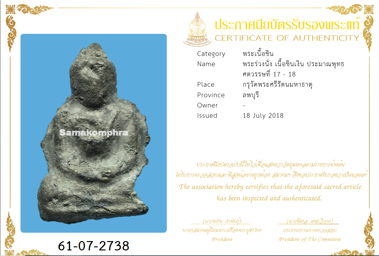 泰國素可泰皇朝是在泰國有700-900年歷史,而這一尊禪定佛陀就是素可泰時代的聖物(在驗證卡上清楚註明1700-1800年之間),雖然在歷史記載中,沒有詳細說明開光的寺廟及高僧,但對有古舊佛牌的朋友都清楚開光的高僧,就是大家認識的高僧祖師傅,這一類古舊佛牌複製造假隨處可以,但要找尋到真品亦非常困難,這佛牌亦經過泰國權威驗證機構沙瑪公鑑定為真品。喜歡收藏古舊聖物的朋友絕對不能錯過