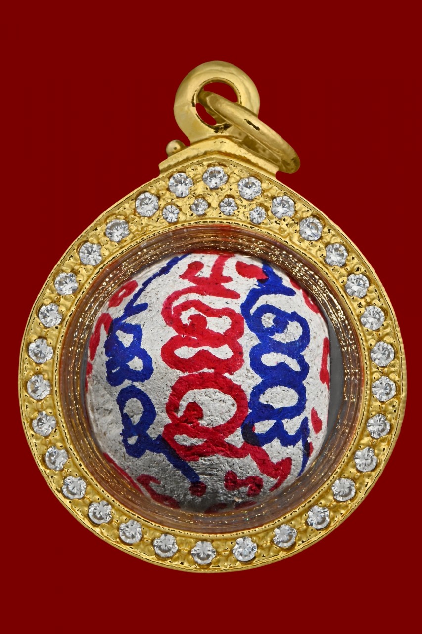 材料: 使用祖師爺阿贊旁廳留下來的經粉與聖料製作,在加持時遵循古法特別磨製紅色刺符墨料一尊一尊親自點上,在符珠上共有五個印記點,祖師爺旁廳之早期的家族符印