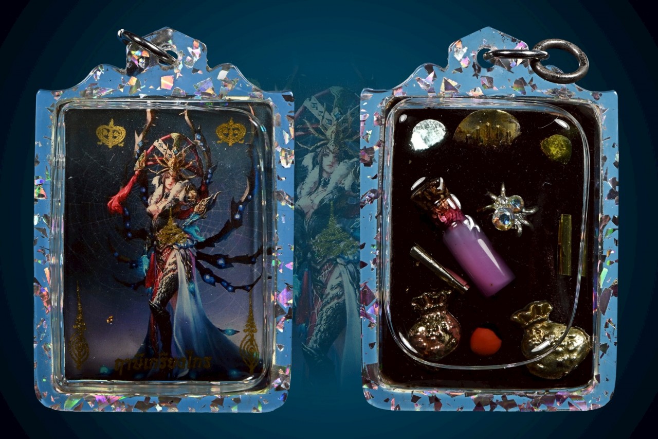 材料 : 蜘蛛仙LOCKET 牌後藏入 香灰 廟泥 經粉 人緣膏 錢袋 招財符通 人緣魅力符通 天然寶石 及注入人緣油