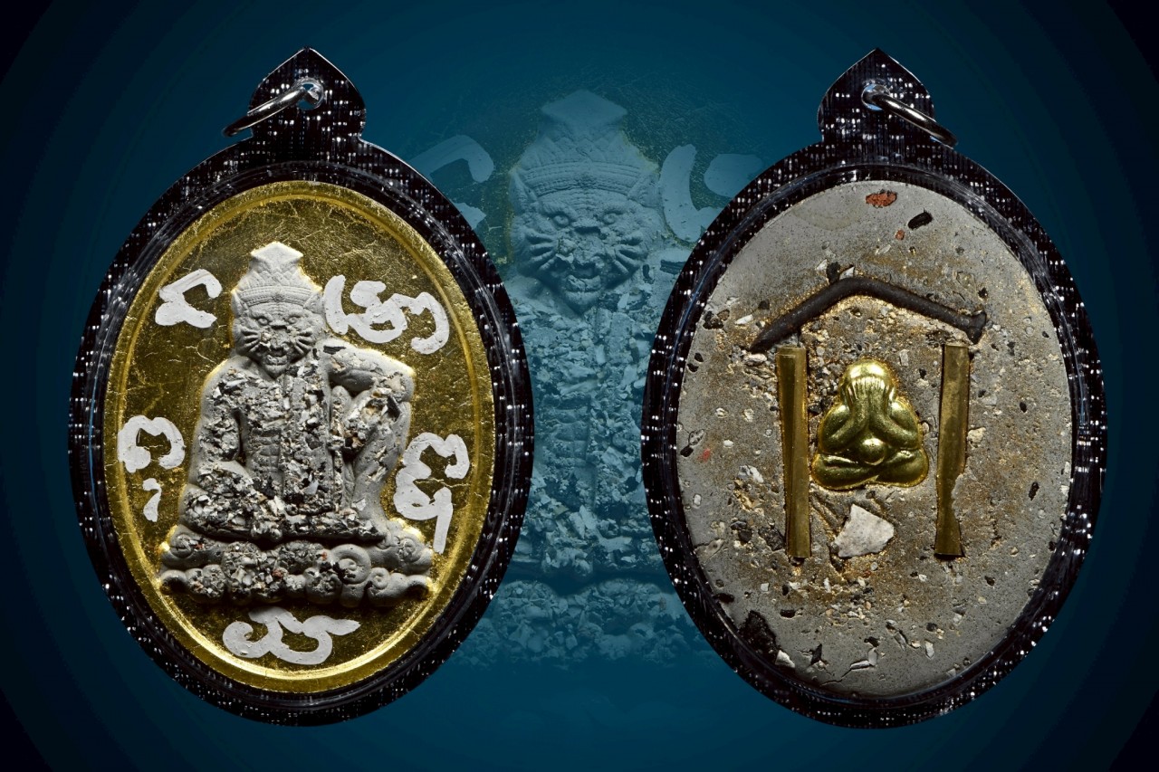 材料 : 這一期的虎頭魯士 用上龍婆拉架大師獨有的陰性材料 碰派粉 格獨 牌後藏有棺材釘 必打佛牌 2枝符通 及佛牌底部藏入3枝符通 並由龍婆拉架大師親手寫上經文符咒